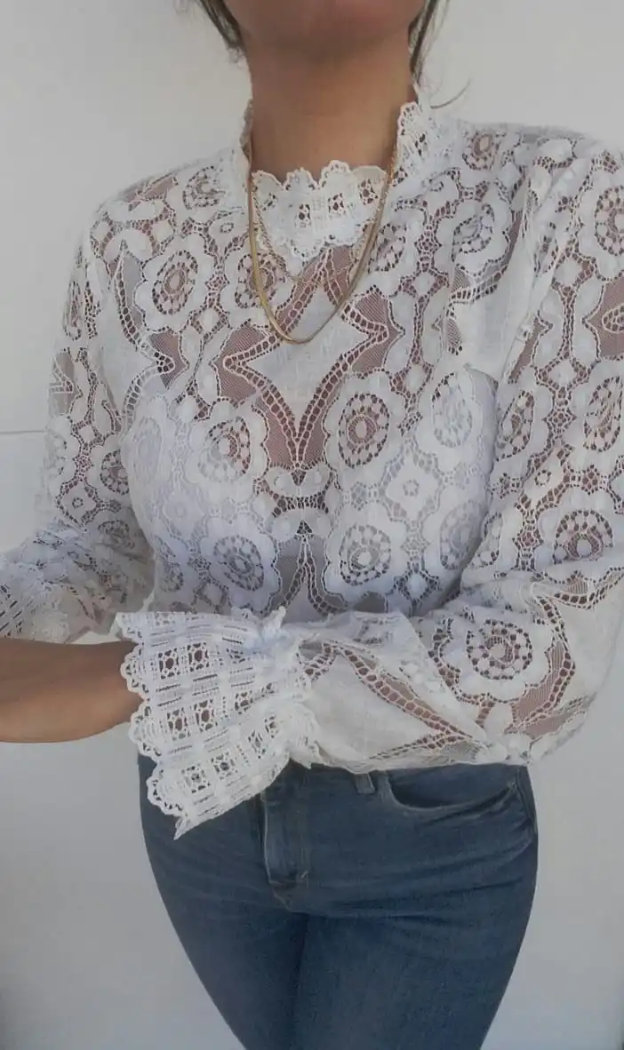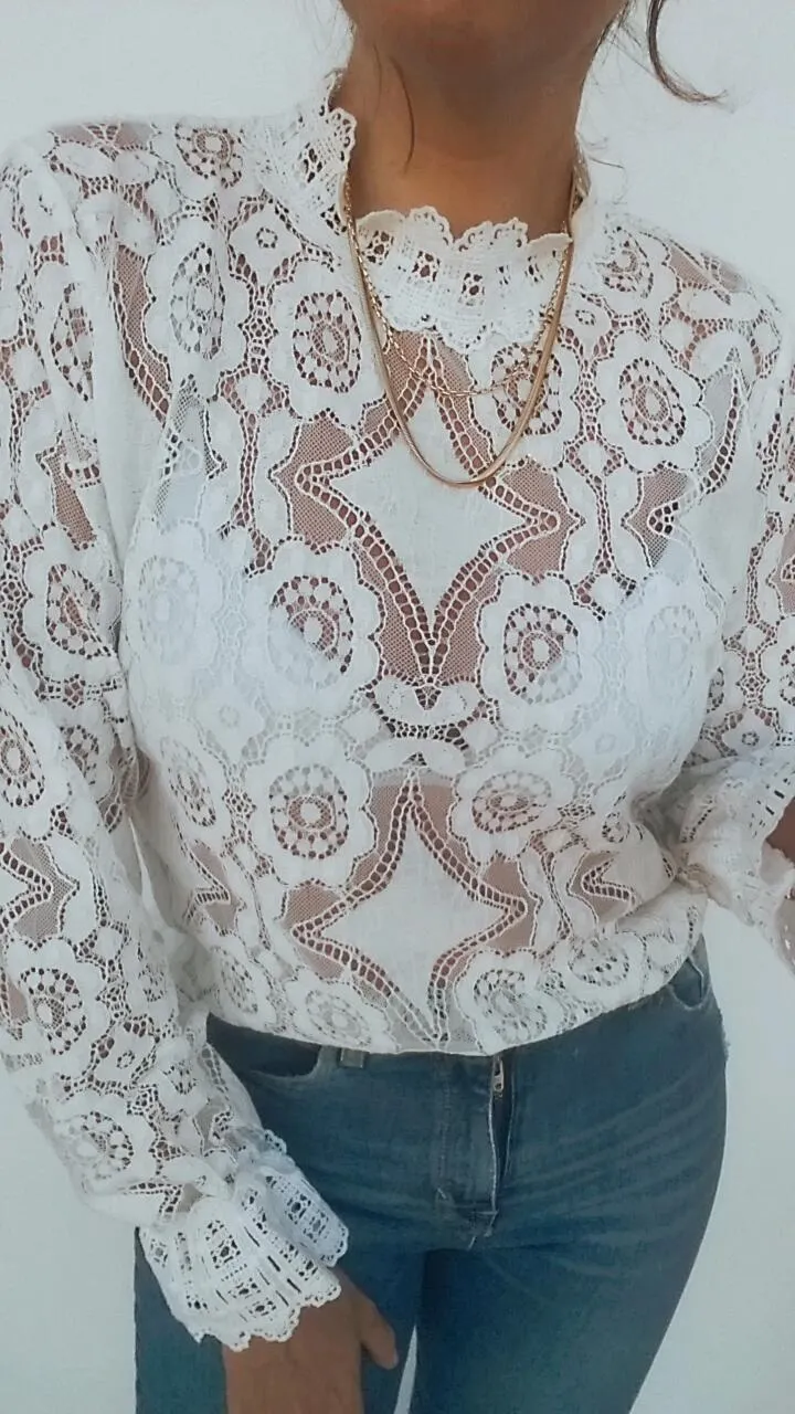 Женская кружевная блузка с вышивкой, белая блузка с длинными рукавами-фонариками, лето 2019