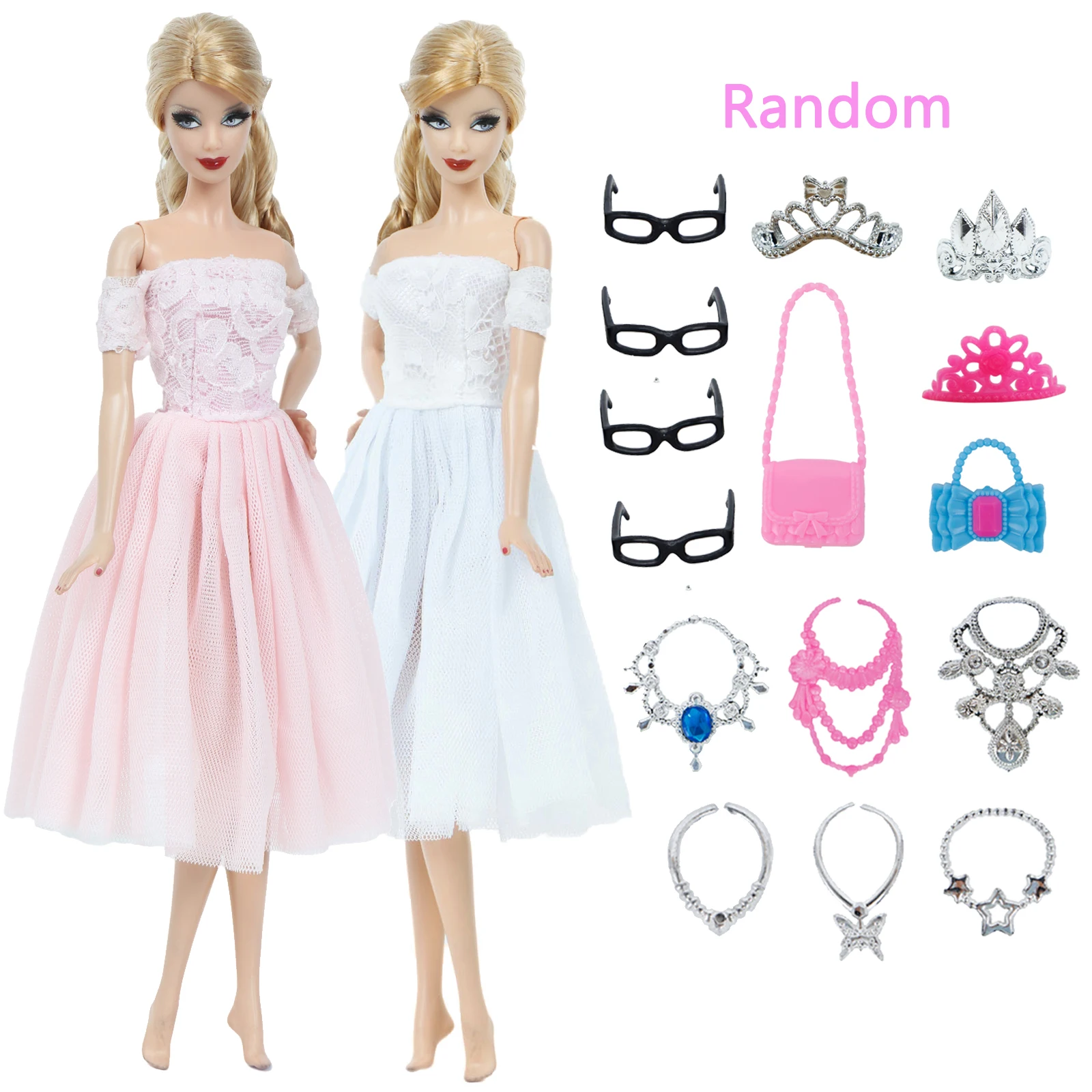 17 шт. = 15 случайных аксессуаров + 2 кружевных мини-платья принцессы вечерние платья сумка очки корона ожерелье Одежда для кукол Барби игрушки