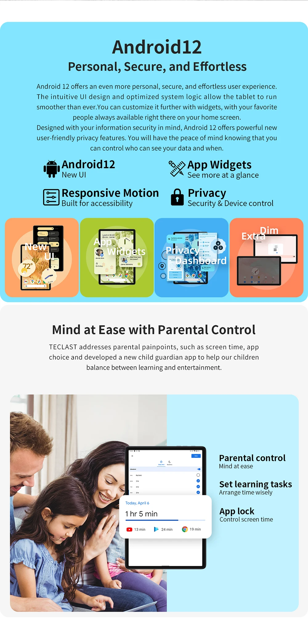 The tablet is really amazing, the kids are very happy. All parameters correspond. Android 10, 6GB RAM and 128GB ROM. In AnTuTu benchmark v8.5.2 the score reached 209369 points, which is really great for a Tablet in this price category. Even twice as expensive devices do not achieve such performance. It came perfectly packaged. Thank you..