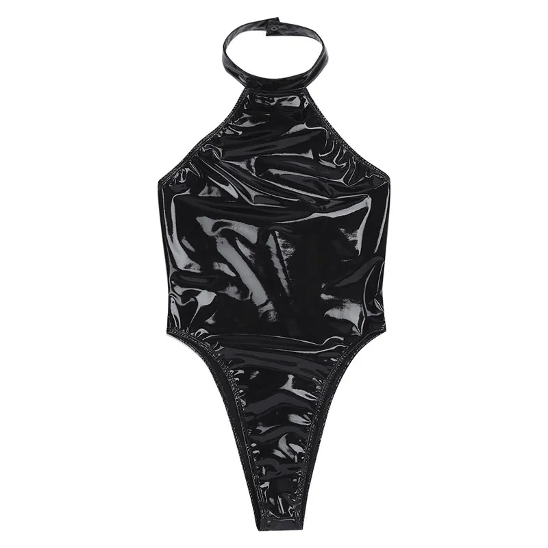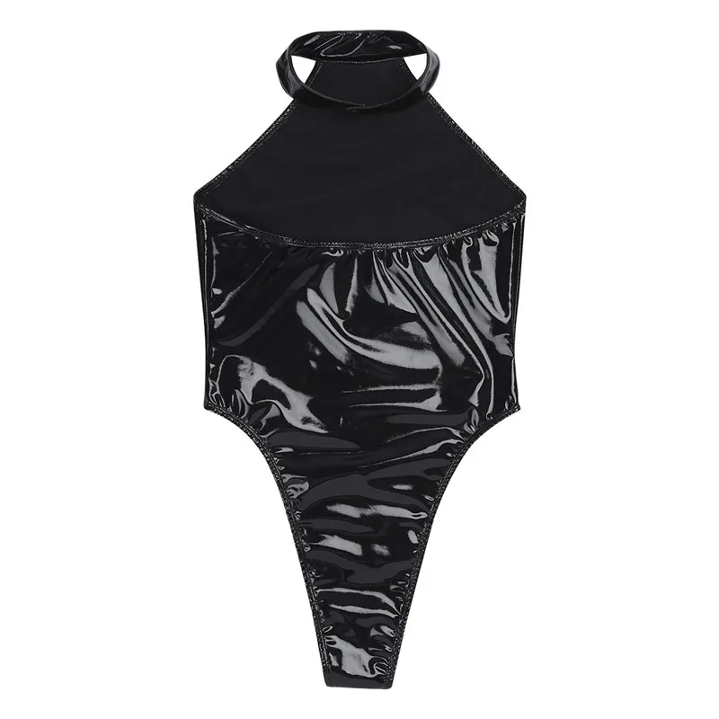 Для женщин Цельный из лакированной кожи, облегающий костюм из леотарда для. Воротник-стойка с лямкой на шее. Дизайн с открытой спиной и высоким разрезом, без рукавов и с водно-болотным эффектом. Лучший выбор для танцев, ночных клубов, вечерние Ночники и нижнее белье.
