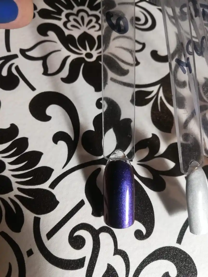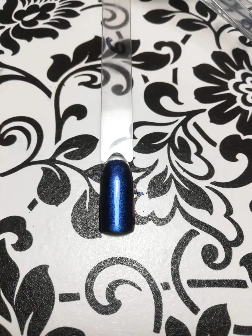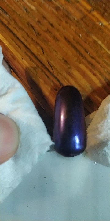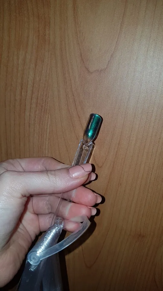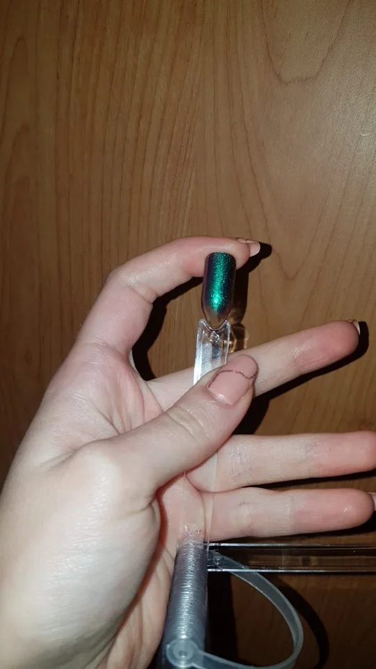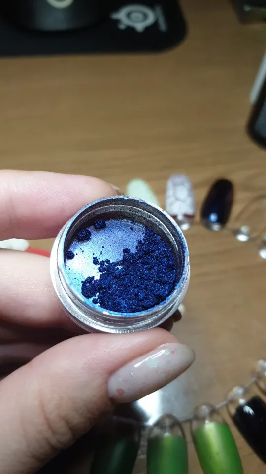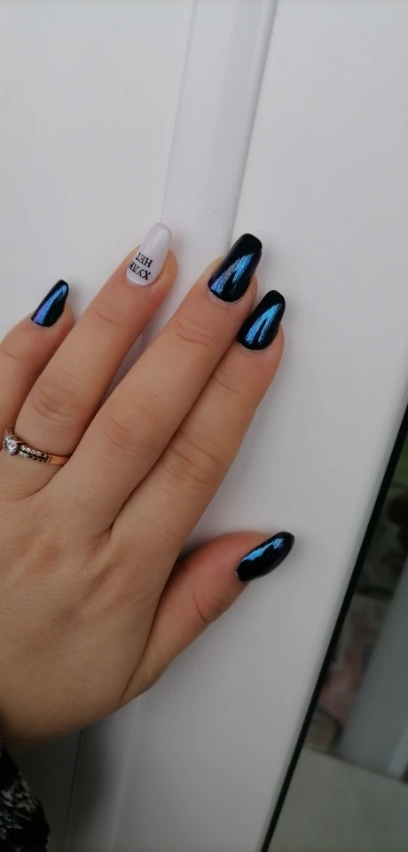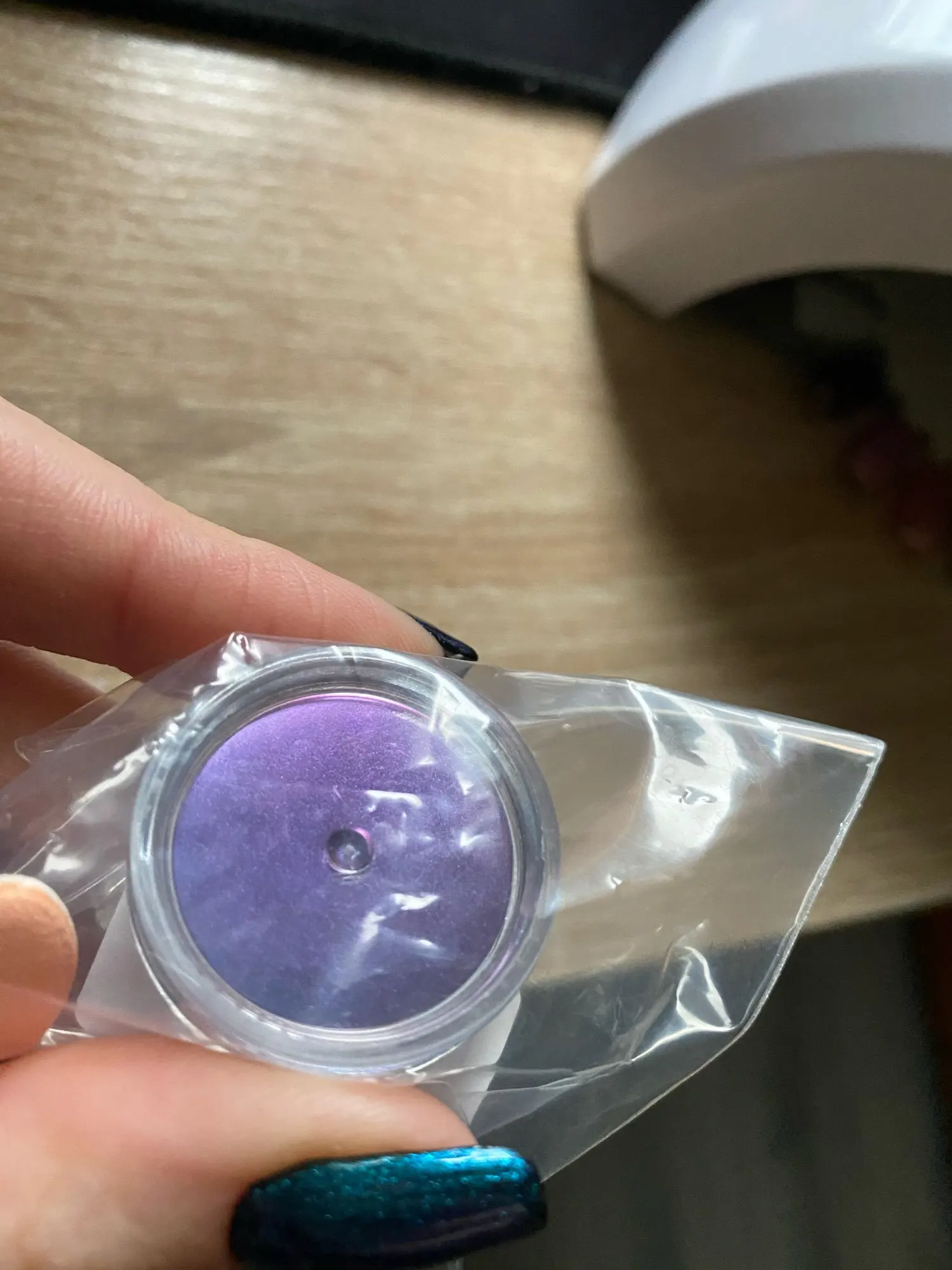 Товар пришёл за месяц. В баночке не так уж и много, на фото не совсем это видно. Но втирка хорошая, я с начало была удивлена, почему она не переливается из синего в фиолетовый, но когда покрутила типсу, цвета начали переливаться. Мне понравилась втирка, цвет приятный, на носила на белый гель лак