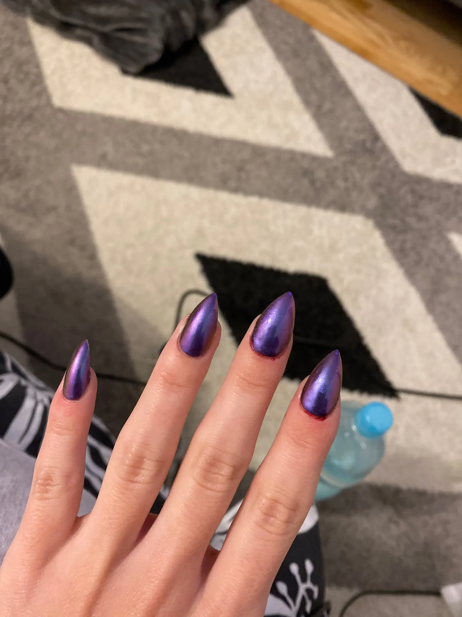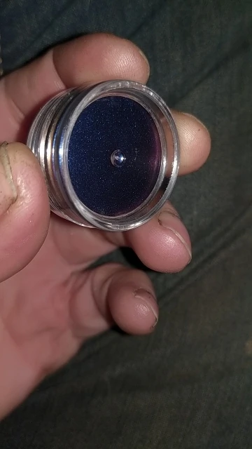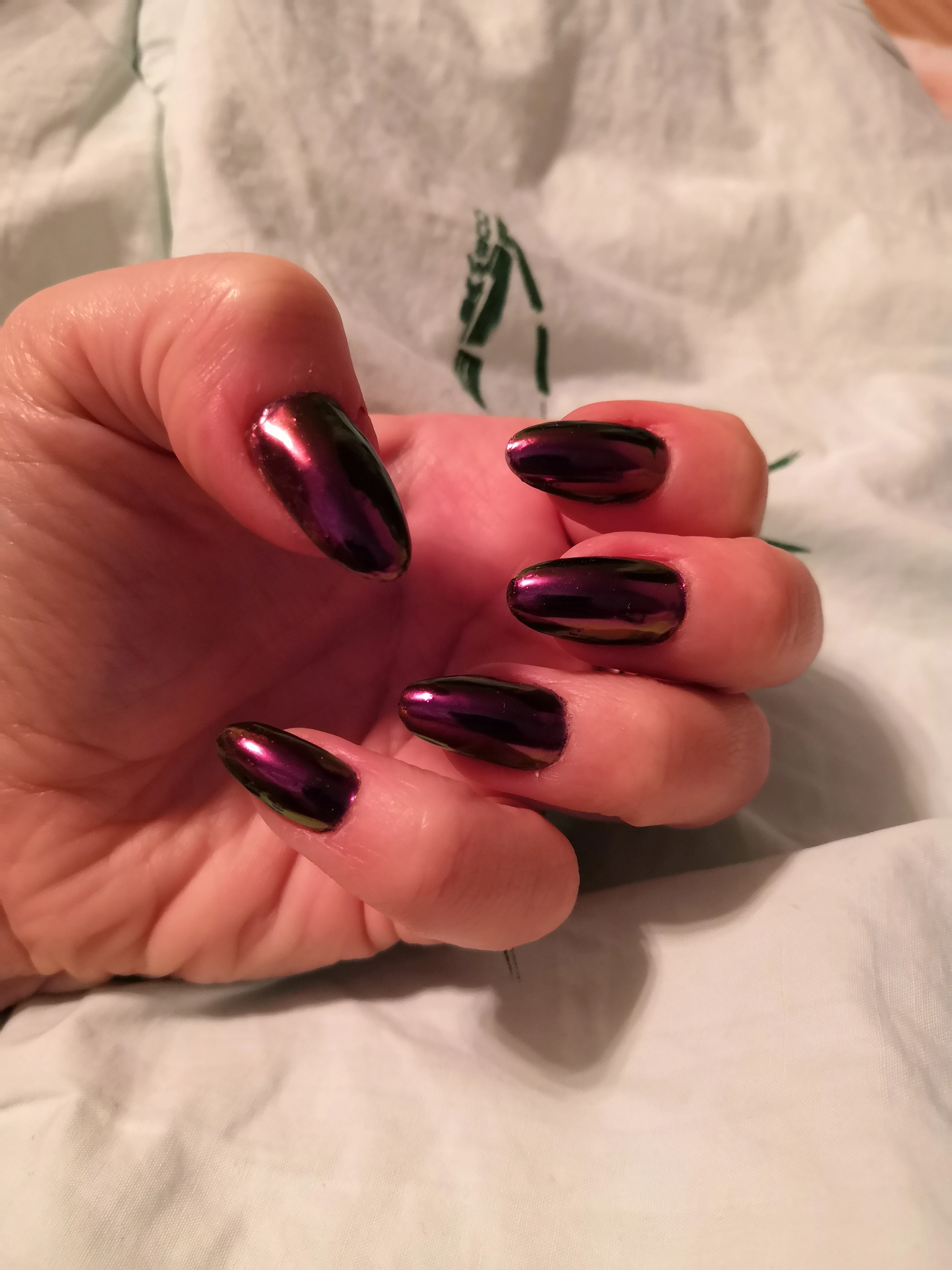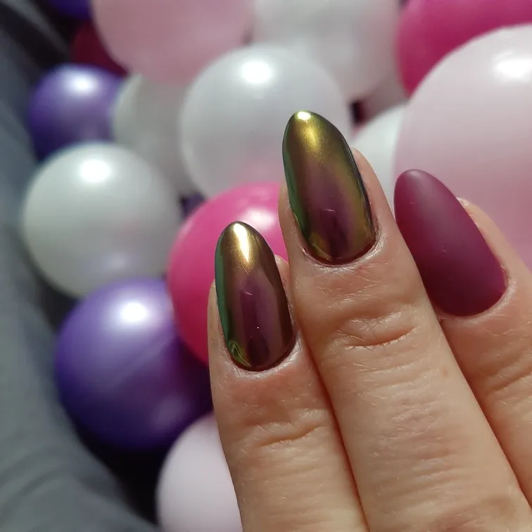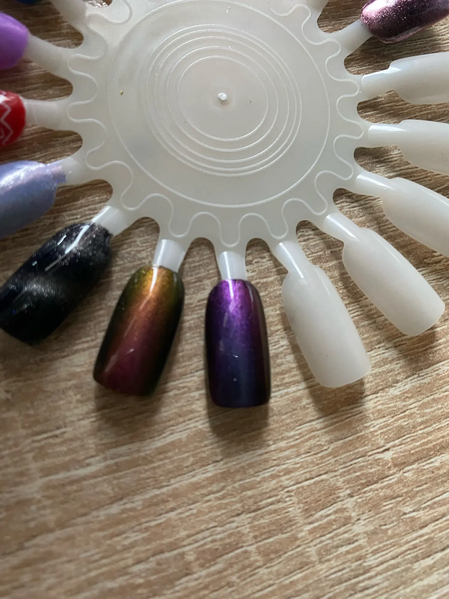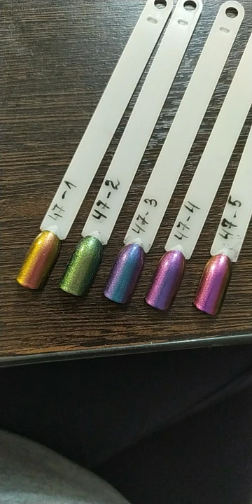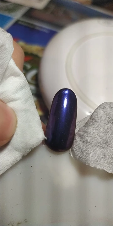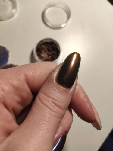 Товар пришёл за месяц. В баночке не так уж и много, на фото не совсем это видно. Но втирка хорошая, я с начало была удивлена, почему она не переливается из синего в фиолетовый, но когда покрутила типсу, цвета начали переливаться. Мне понравилась втирка, цвет приятный, на носила на белый гель лак