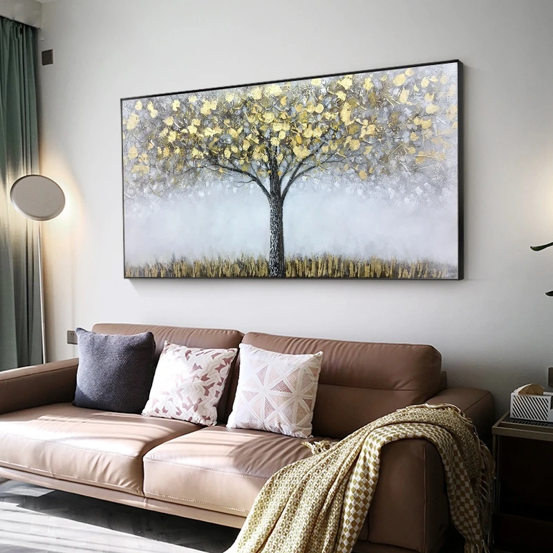 2021 Новое богатое дерево Золотая ручная роспись, ресторанная роспись, большое Золотое серое дно, абстрактная живопись, картины