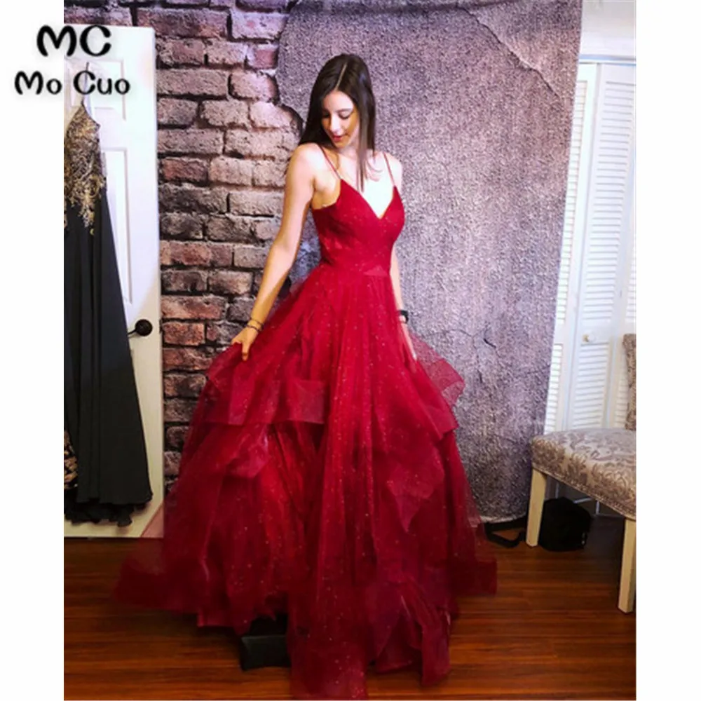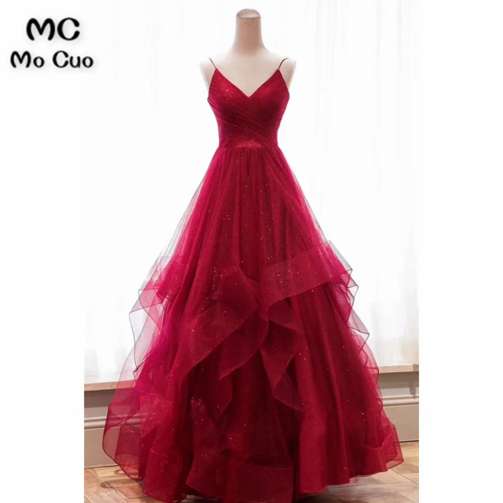 Женское вечернее платье на тонких бретельках, бордовое бальное платье с оборками и глубоким V-образным вырезом, Тюлевое платье для выпускного вечера, индивидуальный пошив