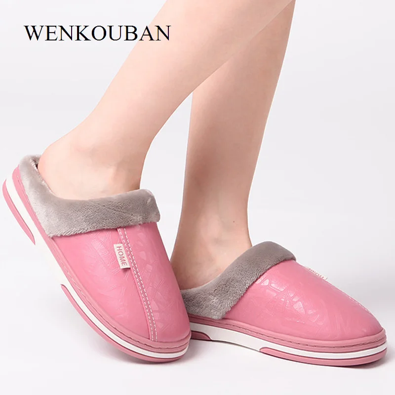 Женские тапочки, кожаные зимние домашние тапочки, меховые шлепанцы, водонепроницаемые женские теплые плюшевые тапочки для пары, женские тапочки размера плюс