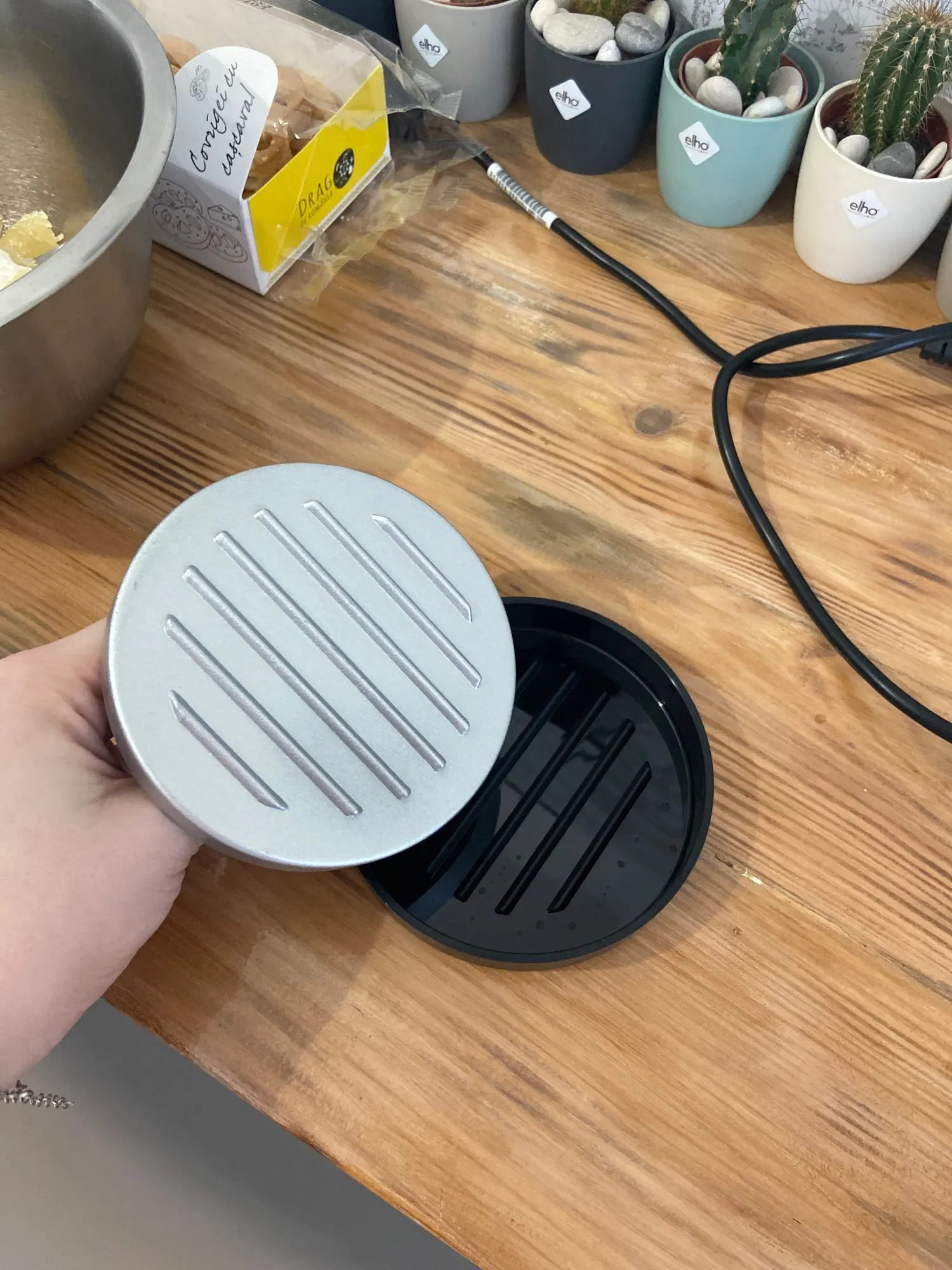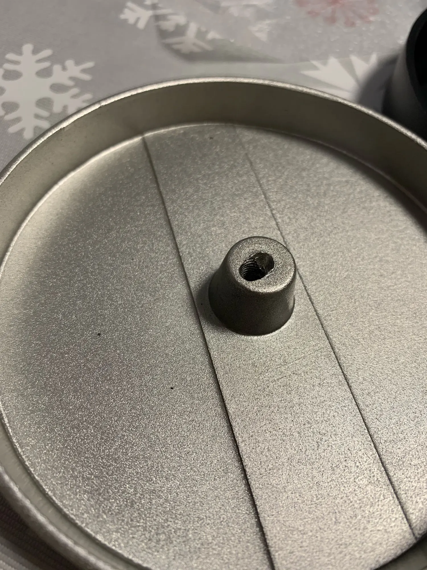 Пластиковое дно. Алюминиевый верх. Глубина около 3 см. Все в порядке