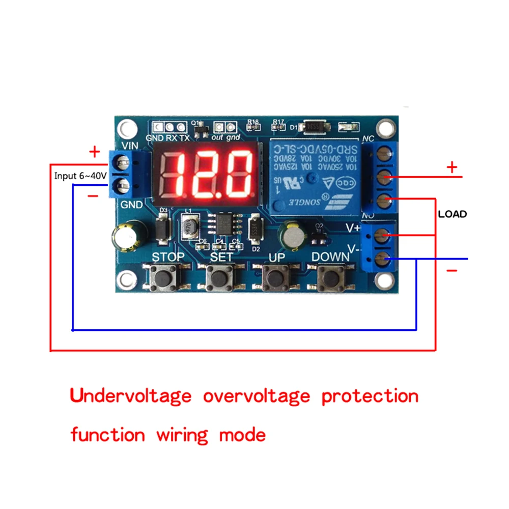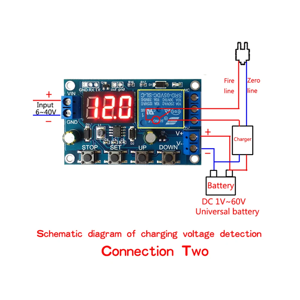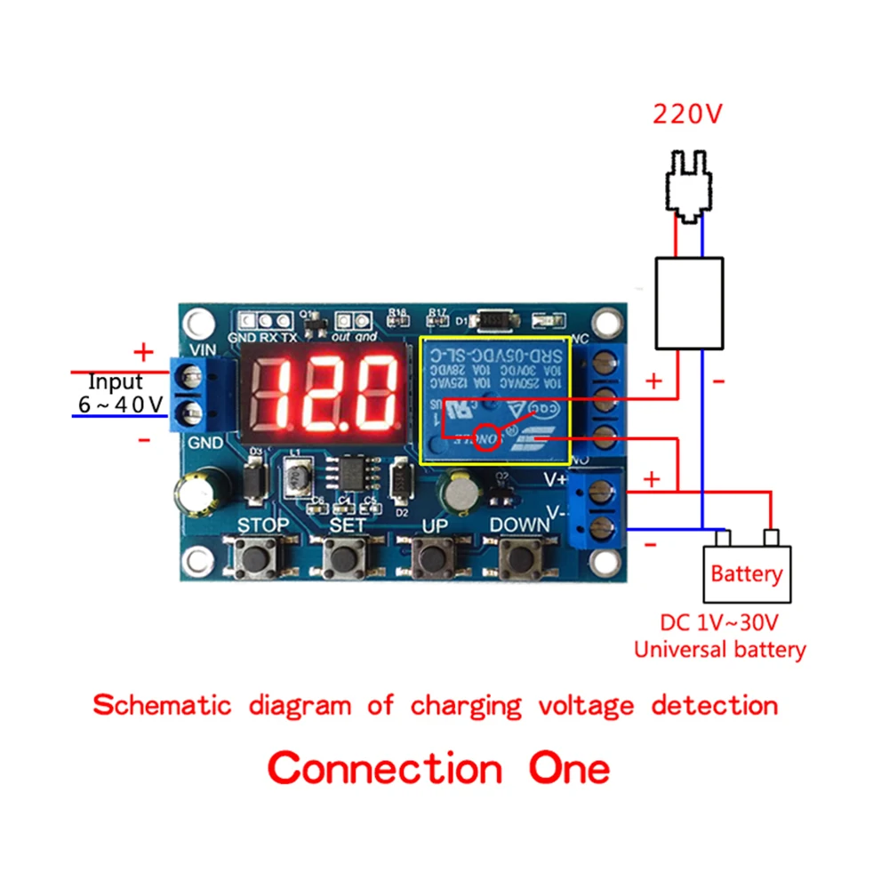 Основные характеристики модуля:1. Интеллектуальное управление зарядкой и разрядкой аккумулятора;2. Вы можете установить время зарядки и разрядки;3. С функцией последовательной связи, мониторинг в реальном времени рабочего состояния реле через последовательный порт;4. Дополнительный сигнал на выходе, когда реле отвечает условиям, выход высокий, вы можете управлять другим оборудованием.5. Кнопка аварийной остановки (кнопка остановки), с обратной защитой, обратная не горит.Режим работы:Верхний предел напряжения: UL1, нижний предел напряжения nL1, верхний предел напряжения больше, чем нижний предел напряжения (UL1> nL1)U-1: измерение зарядки: Когда измеренное напряжение ниже нижнего предельного напряжения, реле тянет выше; Верхнее предельное напряжение, реле отключено.U-2: контроль времени измерения заряда: Установите время зарядки (OP); Когда измеренное напряжение ниже нижнего предельного напряжения, реле вытягивает, а затем запускает обратный отсчет времени, конец таймера, реле выключено; Когда измеренное напряжение выше верхнего предельного напряжения, Реле отключено.U-3: обнаружение разряда: Когда измеренное напряжение ниже нижнего предельного напряжения, реле выключено, выше верхнего предельного напряжения, реле тянет;U-4: контроль времени обнаружения разряда: Установите время разряда (OP); Когда измеренное напряжение выше верхнего предельного напряжения, реле тянется, а затем начните обратный отсчет времени, конец таймера, реле выключено; Когда измеренное напряжение ниже нижнего предельного напряжения, Реле Отключено;U-5: напряжение в диапазоне, натяжение реле: Когда измеренное напряжение между верхним и нижним пределами, натяжение реле, другие обстоятельства открываются;U-6: напряжение вне интервала, реле тянет: измеренное напряжение ниже нижнего предельного напряжения или выше, чем Верхнее предельное напряжение, реле тянет, другой чехол реле выключен.Параметры:1: Мощность Напряжение питания: DC6--40V, диапазон индикатора напряжения постоянного тока 0-60V, подходит для людей весом меньше 60V различных аккумулятор и зарядное устройство напряжения погрешности при снятии мерок 0,1 V.2: Время зарядки и разрядки (OP) Диапазон: 0 - 999 минут.Как я могу задать параметры?1. Во-первых, в соответствии с их потребностями, для определения требований рабочей модели;2. В соответствии с режимом работы реле, в главном интерфейсе (Когда модуль включен, он будет мигать текущий режим работы, режим по умолчанию U-1, И затем введите основной интерфейс) нажмите кнопку SET в течение 2 секунд, а затем отпустите, введите интерфейс выбора режима, Вверх, вниз, чтобы выбрать режим, который нужно установить (U-1 ~ U-6);3. После выбора режима, предположим, что мы выбрали режим U-1 и нажмите кнопку SET, чтобы установить соответствующий параметр. Заданный параметр будет мигать (верхний предел напряжения UL1, нижний предел напряжения nL1, время проводимости OP), нажимать вверх, вниз ключ для увеличения или уменьшения, вы всегда можете нажать клавишу для быстрого увеличения или уменьшения, нажмите кнопку SET, чтобы установить текущий режим следующего параметра, Процесс выше;4. Установите параметры, а затем нажмите кнопку Set в течение 2 секунд, чтобы отпустить, режим настройки тока будет мигать, а затем вернуться к основному интерфейсу, Установите параметры успеха!5. В главном интерфейсе нажмите кла