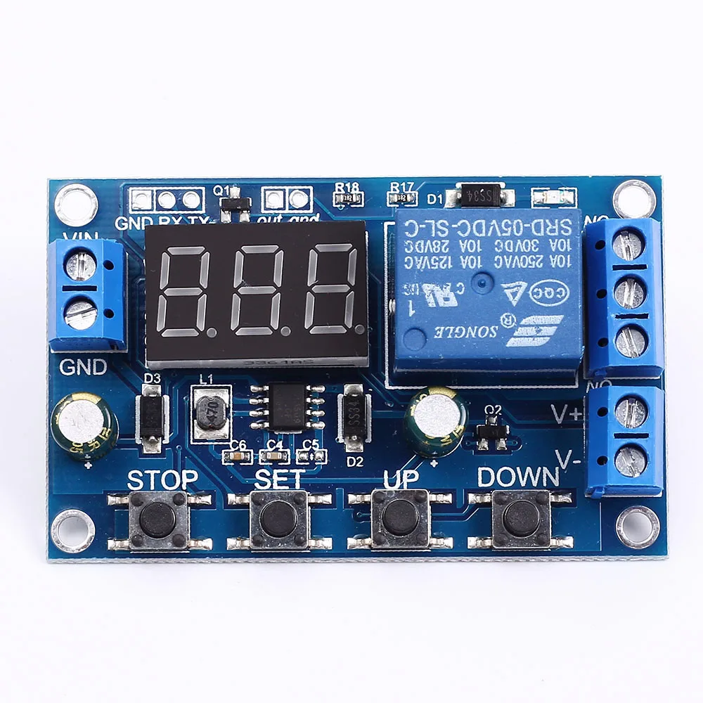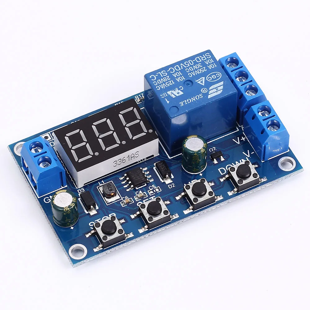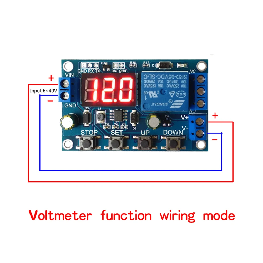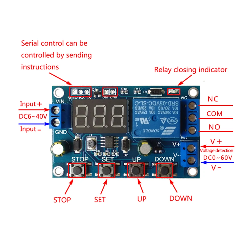 Основные характеристики модуля:1. Интеллектуальное управление зарядкой и разрядкой аккумулятора;2. Вы можете установить время зарядки и разрядки;3. С функцией последовательной связи, мониторинг в реальном времени рабочего состояния реле через последовательный порт;4. Дополнительный сигнал на выходе, когда реле отвечает условиям, выход высокий, вы можете управлять другим оборудованием.5. Кнопка аварийной остановки (кнопка остановки), с обратной защитой, обратная не горит.Режим работы:Верхний предел напряжения: UL1, нижний предел напряжения nL1, верхний предел напряжения больше, чем нижний предел напряжения (UL1> nL1)U-1: измерение зарядки: Когда измеренное напряжение ниже нижнего предельного напряжения, реле тянет выше; Верхнее предельное напряжение, реле отключено.U-2: контроль времени измерения заряда: Установите время зарядки (OP); Когда измеренное напряжение ниже нижнего предельного напряжения, реле вытягивает, а затем запускает обратный отсчет времени, конец таймера, реле выключено; Когда измеренное напряжение выше верхнего предельного напряжения, Реле отключено.U-3: обнаружение разряда: Когда измеренное напряжение ниже нижнего предельного напряжения, реле выключено, выше верхнего предельного напряжения, реле тянет;U-4: контроль времени обнаружения разряда: Установите время разряда (OP); Когда измеренное напряжение выше верхнего предельного напряжения, реле тянется, а затем начните обратный отсчет времени, конец таймера, реле выключено; Когда измеренное напряжение ниже нижнего предельного напряжения, Реле Отключено;U-5: напряжение в диапазоне, натяжение реле: Когда измеренное напряжение между верхним и нижним пределами, натяжение реле, другие обстоятельства открываются;U-6: напряжение вне интервала, реле тянет: измеренное напряжение ниже нижнего предельного напряжения или выше, чем Верхнее предельное напряжение, реле тянет, другой чехол реле выключен.Параметры:1: Мощность Напряжение питания: DC6--40V, диапазон индикатора напряжения постоянного тока 0-60V, подходит для людей весом меньше 60V различных аккумулятор и зарядное устройство напряжения погрешности при снятии мерок 0,1 V.2: Время зарядки и разрядки (OP) Диапазон: 0 - 999 минут.Как я могу задать параметры?1. Во-первых, в соответствии с их потребностями, для определения требований рабочей модели;2. В соответствии с режимом работы реле, в главном интерфейсе (Когда модуль включен, он будет мигать текущий режим работы, режим по умолчанию U-1, И затем введите основной интерфейс) нажмите кнопку SET в течение 2 секунд, а затем отпустите, введите интерфейс выбора режима, Вверх, вниз, чтобы выбрать режим, который нужно установить (U-1 ~ U-6);3. После выбора режима, предположим, что мы выбрали режим U-1 и нажмите кнопку SET, чтобы установить соответствующий параметр. Заданный параметр будет мигать (верхний предел напряжения UL1, нижний предел напряжения nL1, время проводимости OP), нажимать вверх, вниз ключ для увеличения или уменьшения, вы всегда можете нажать клавишу для быстрого увеличения или уменьшения, нажмите кнопку SET, чтобы установить текущий режим следующего параметра, Процесс выше;4. Установите параметры, а затем нажмите кнопку Set в течение 2 секунд, чтобы отпустить, режим настройки тока будет мигать, а затем вернуться к основному интерфейсу, Установите параметры успеха!5. В главном интерфейсе нажмите кла