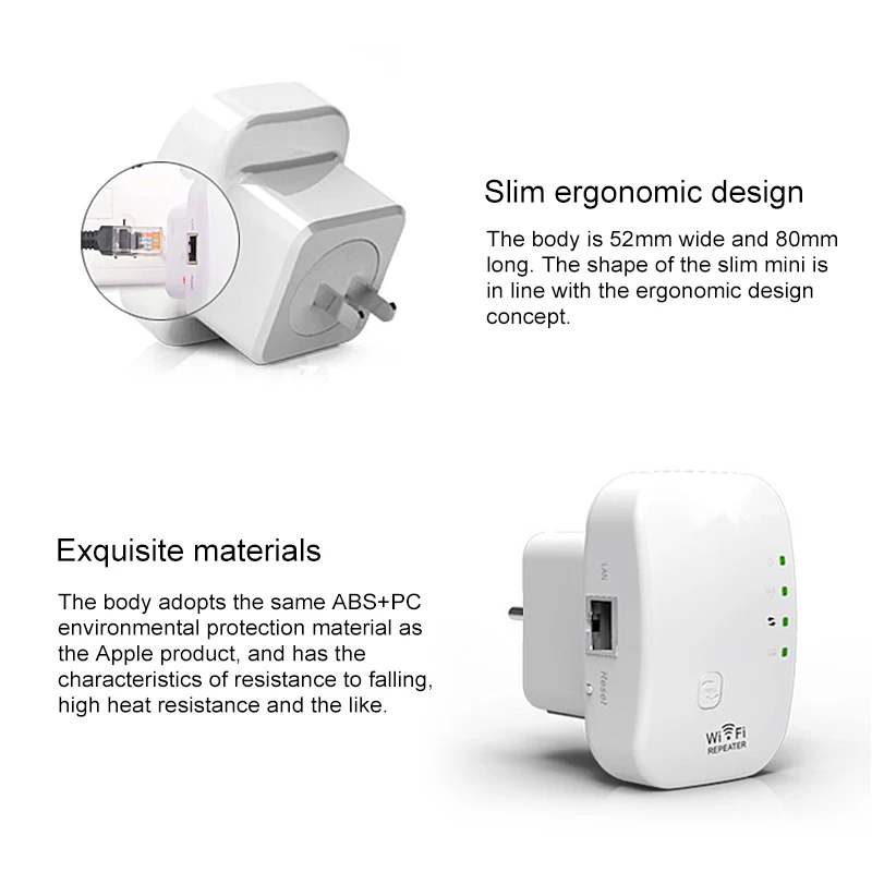 Скорость беспроводной передачи 300 Мбит/с, усилитель сигнала wifi, быстрая скорость, высокая эффективность, компактный портативный, уникальный внешний вид, корпус изготовлен из того же материала ABS + PC, что и продукция Apple, простой и практичный, устойчив к падению, нагреву, огнестойкий, прост в эксплуатации!