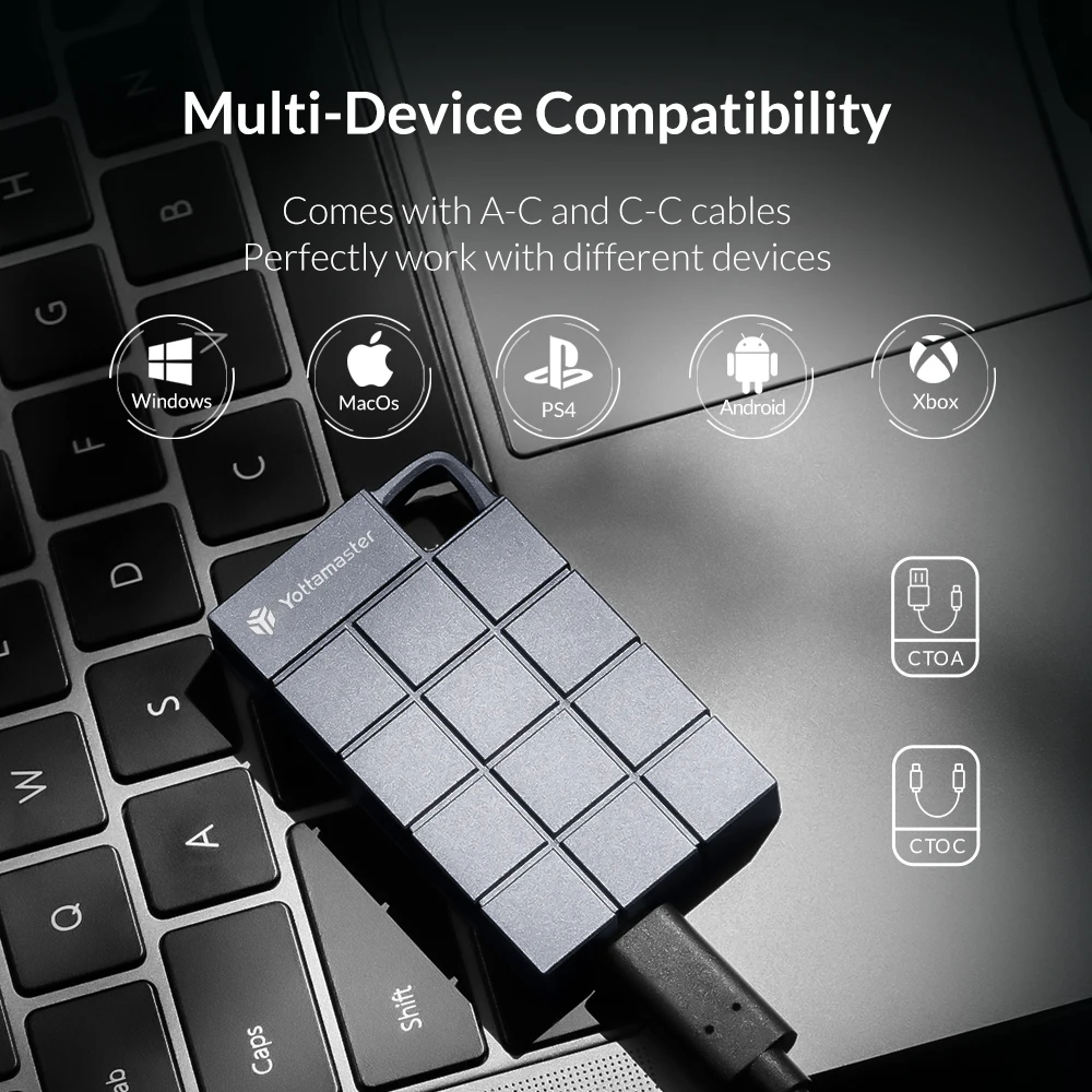 Внешний диск поставляется с USB Type C to C и USB Type C к кабелям. Легко подключаются к Windows PC, Mac, iPad Pro, Xbox, PS4, Android смартфонам и планшетам с портом USB C.