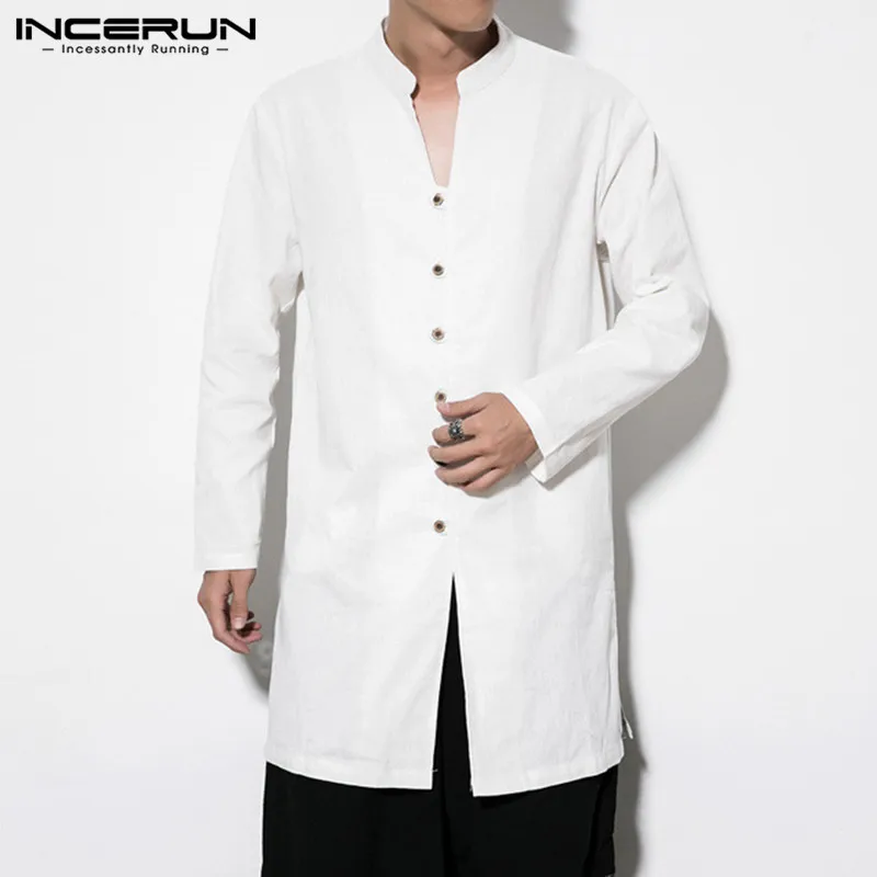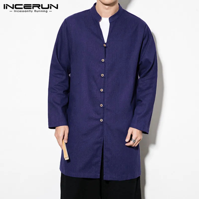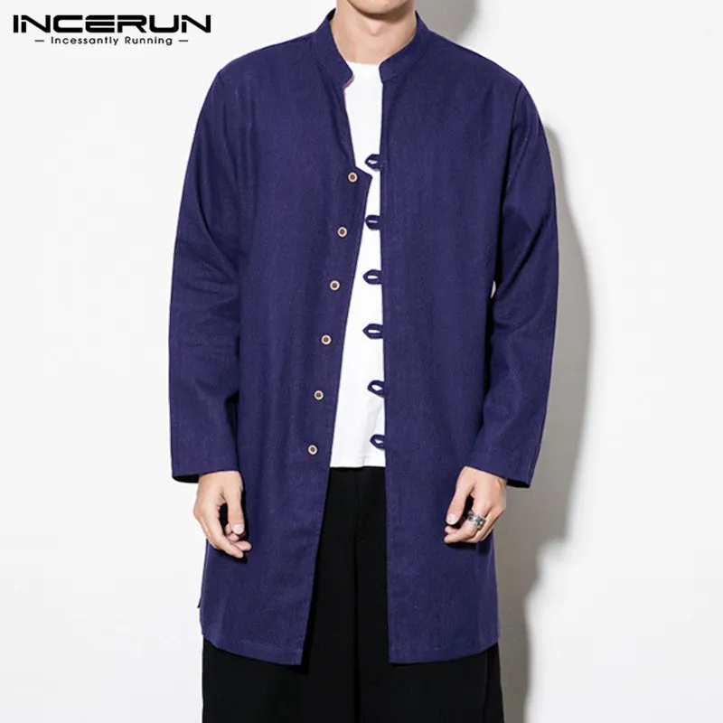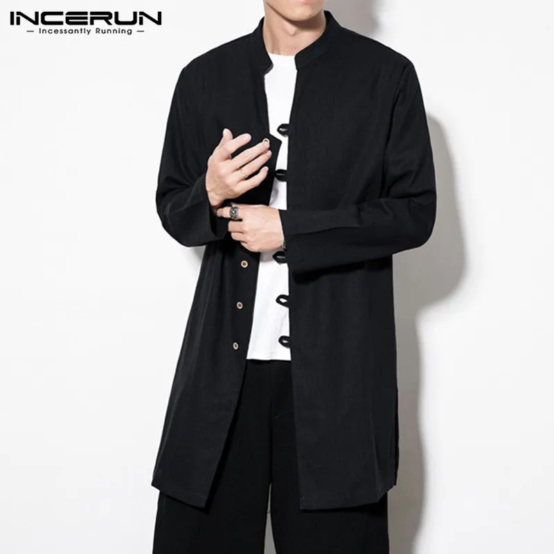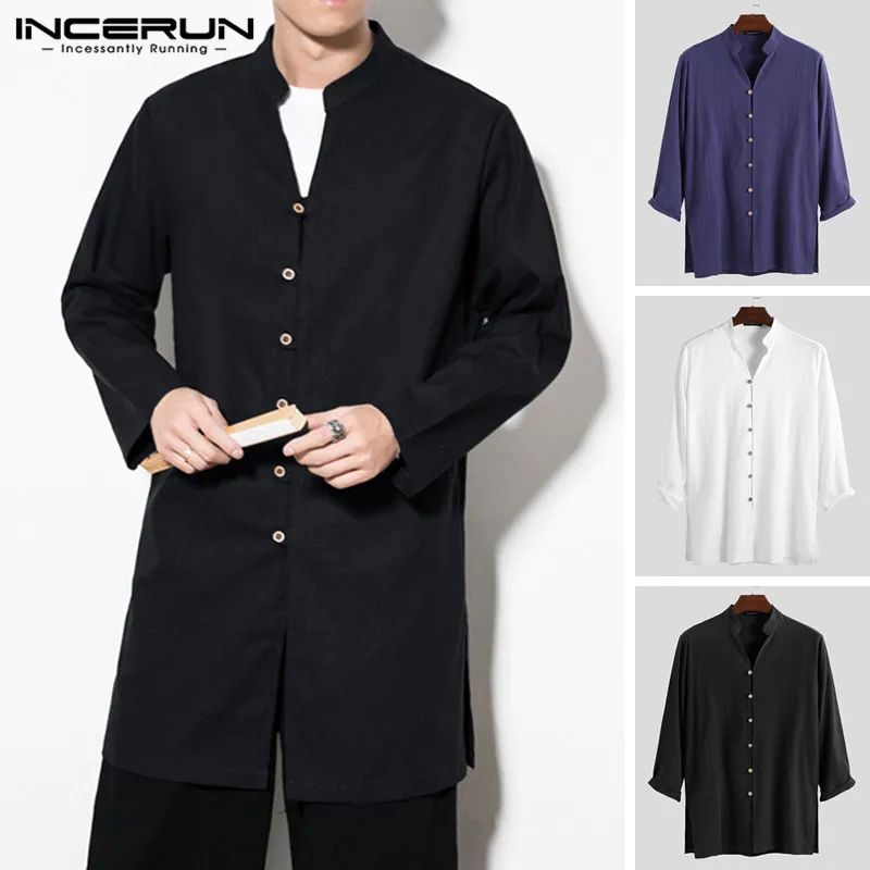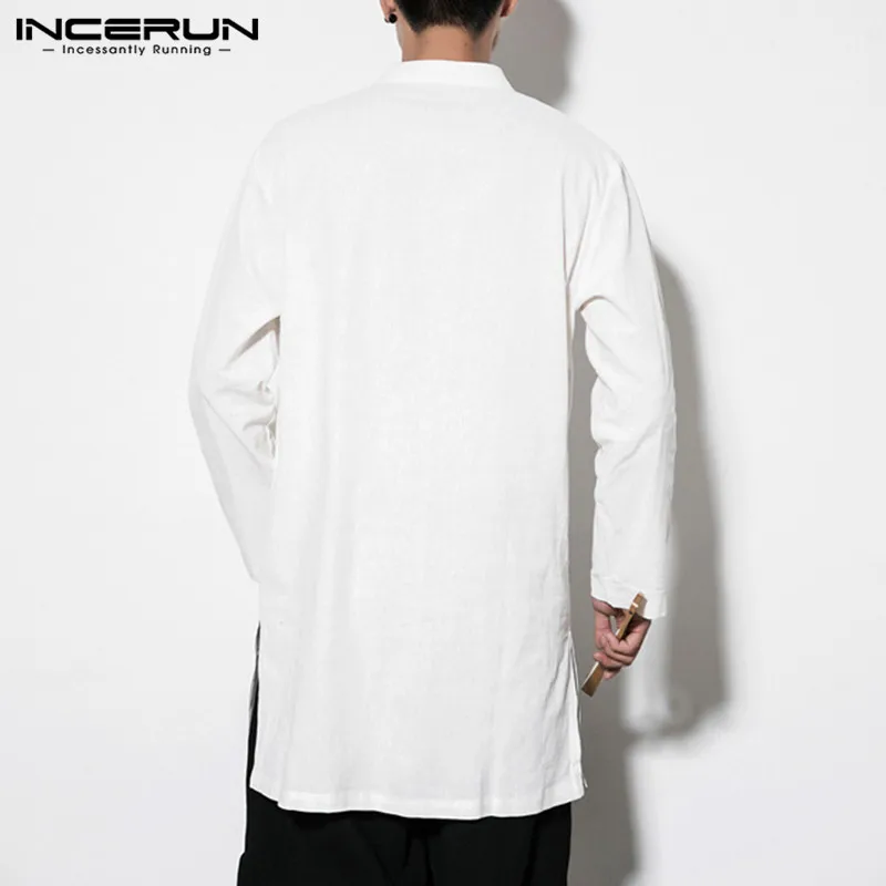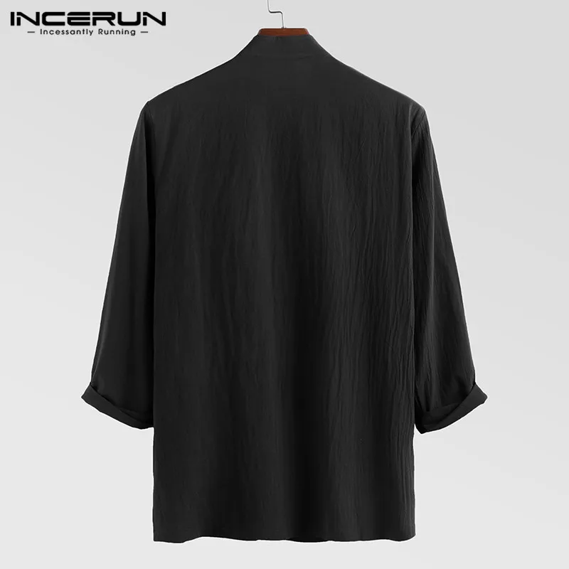 INCERUN мужские рубашки с длинным рукавом в китайском стиле с воротником-стойкой, повседневная однотонная винтажная длинная рубашка Кунг-фу для мужчин 2020 Camisa Masculina S-5XL
