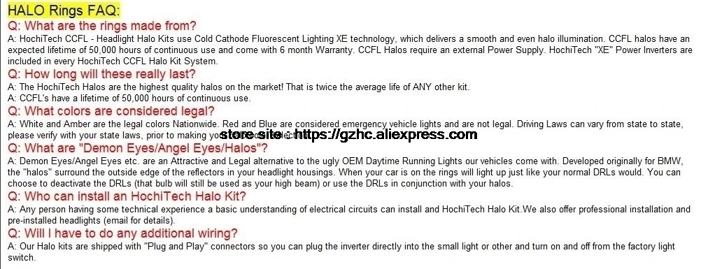 В комплект входит:• 4 или 2 Кольца CCFL (для фар)• 2 шт. или 4 шт.ИнверторыДля CCFL Angel Eeyes!• 1 шт. подробные инструкции по установке на английском языке