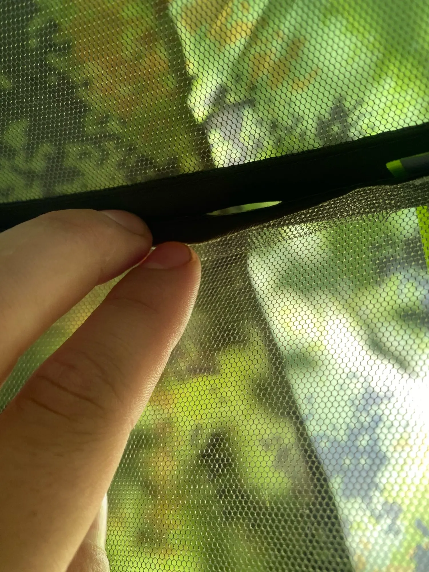 Ткань линяет. Краска капает, если попасть под дождь. Сетка пропускает мошек.