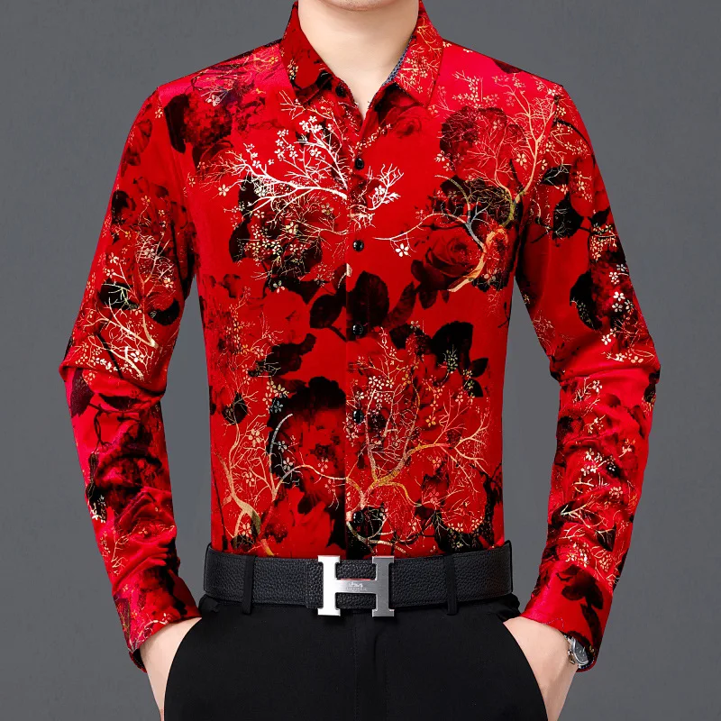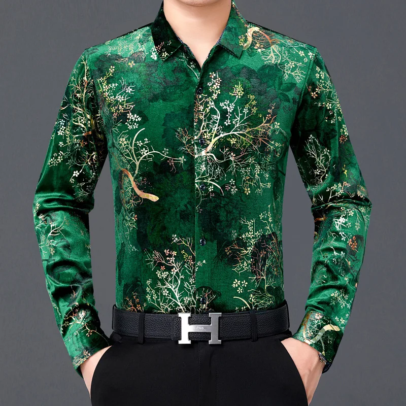 Высококачественная модная Свободная рубашка с длинным рукавом и цветочным принтом, Новое поступление, качественная мягкая удобная мужская рубашка с золотым бархатным узором