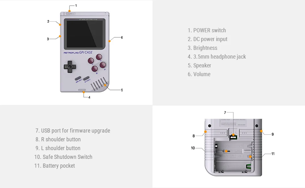 1. Безопасное отключение2. 3,5 мм аудио порт3. Светодиодный индикатор питания4. 2,8 дюймов IPS экран5. Чехол для игрового мальчика Raspberry Pi6. Совместим с Raspberry Pi ZERO, ZERO W