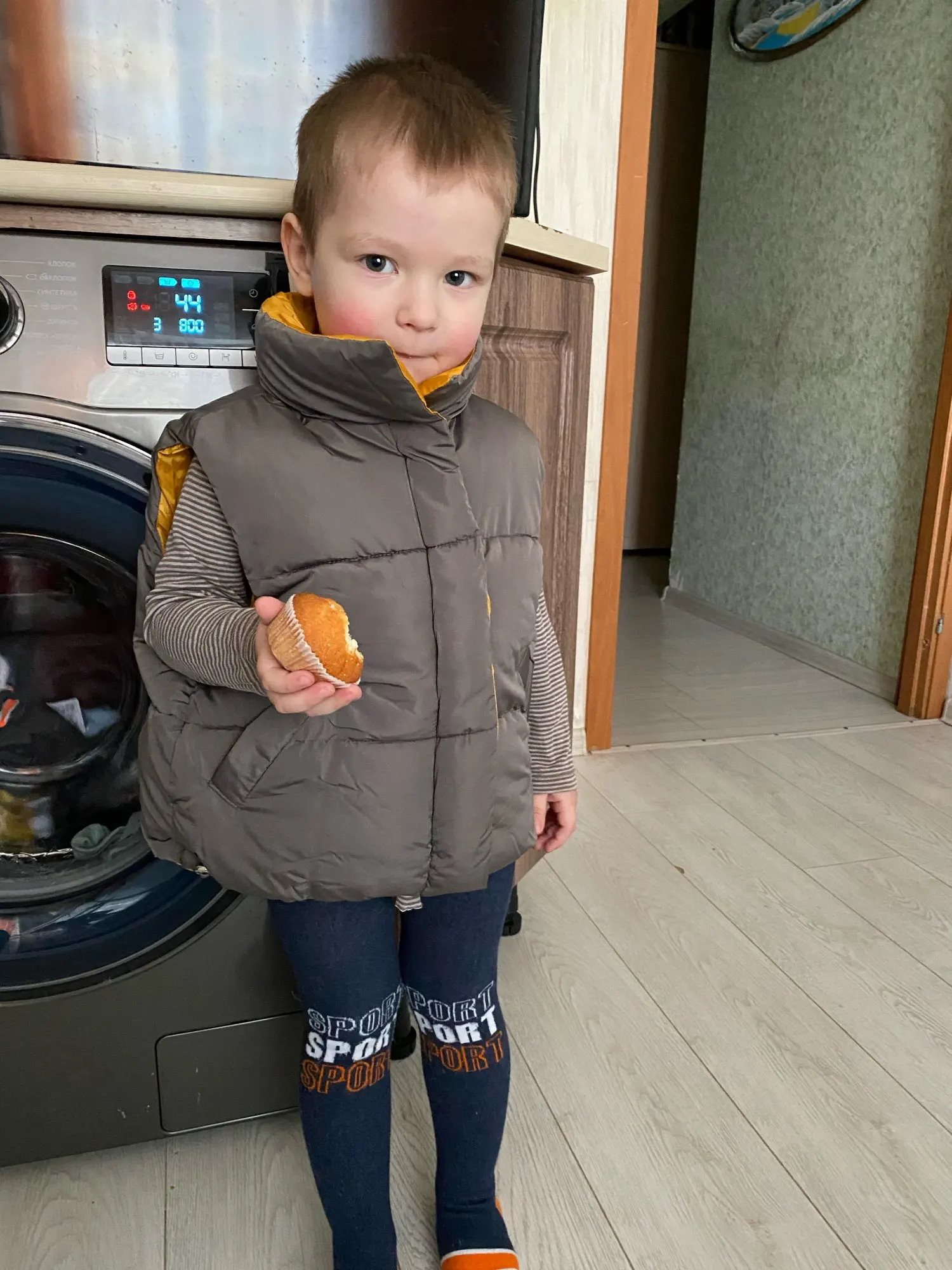 Классная ! Маломерит . Брала на рост 92 3т. В самый раз . Хотите брать с запасом берите больше на 2 размера . Но учтите , что жилетка широкая . Рукава вырезы большие . Будет болтаться без размера и смотреться не очень . Это лично мое мнение . А так всё классно. Тёплая , стильная