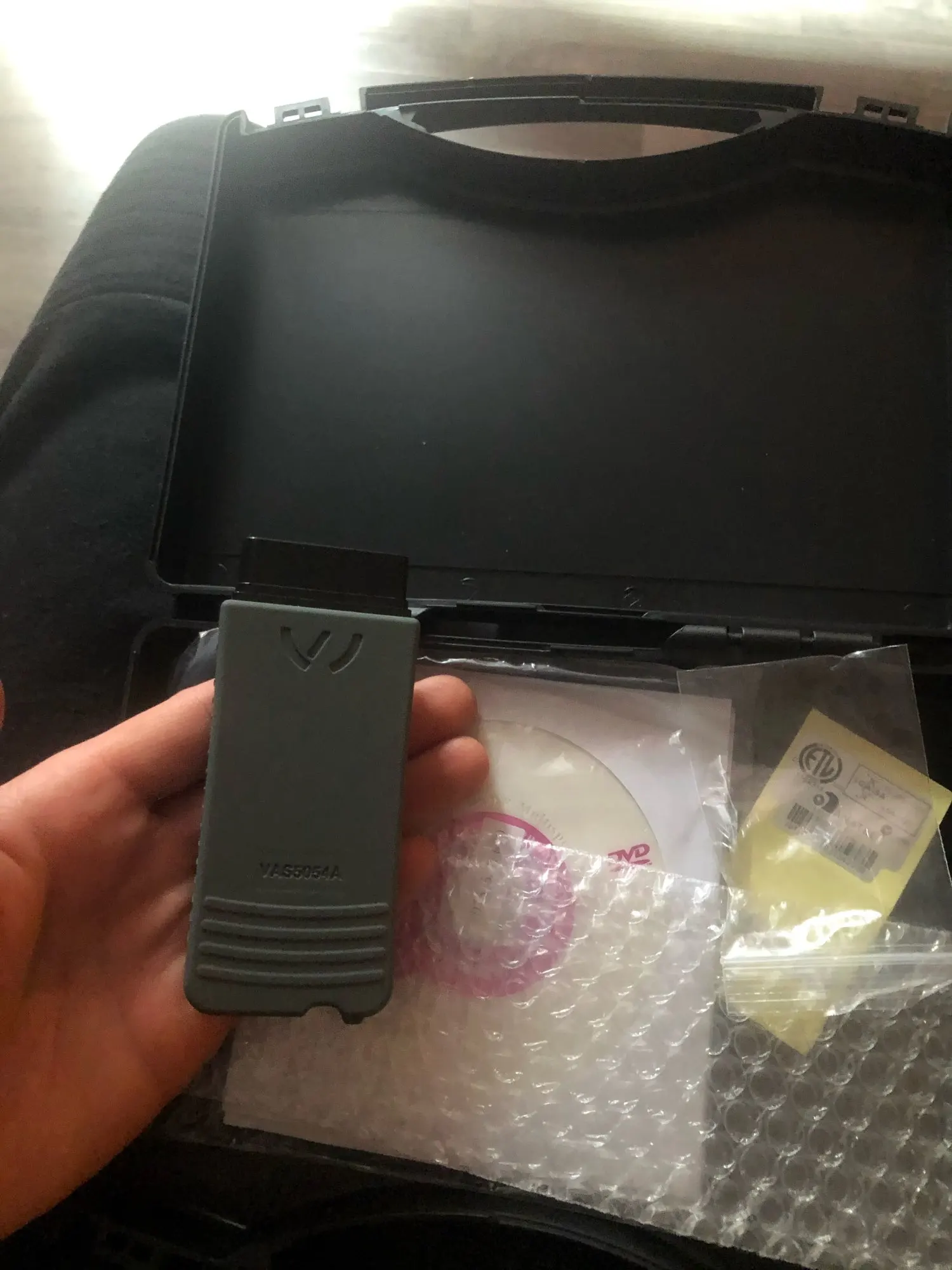 Получил очень быстро - 4 дня с момента заказа (курьером на дом). Пластиковый бокс классный (теперь вся диагностика в одном боксе будет), адаптер 5054А выглядит отлично. Всё установить с дисков и попробовать не было времени пока