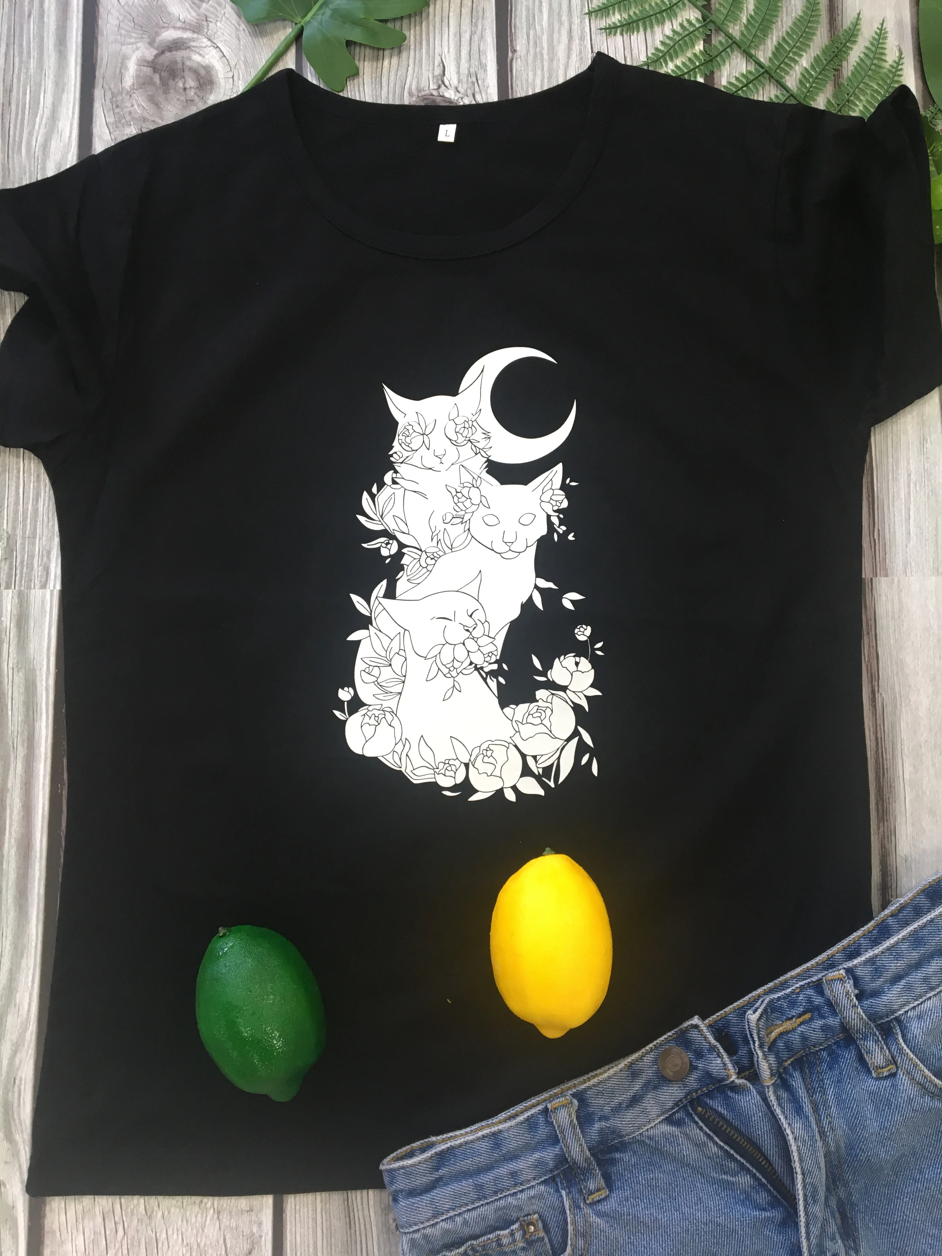 Женская футболка в стиле хипстера, из 100% хлопка, в готическом стиле, с изображением головы кошки и Луны