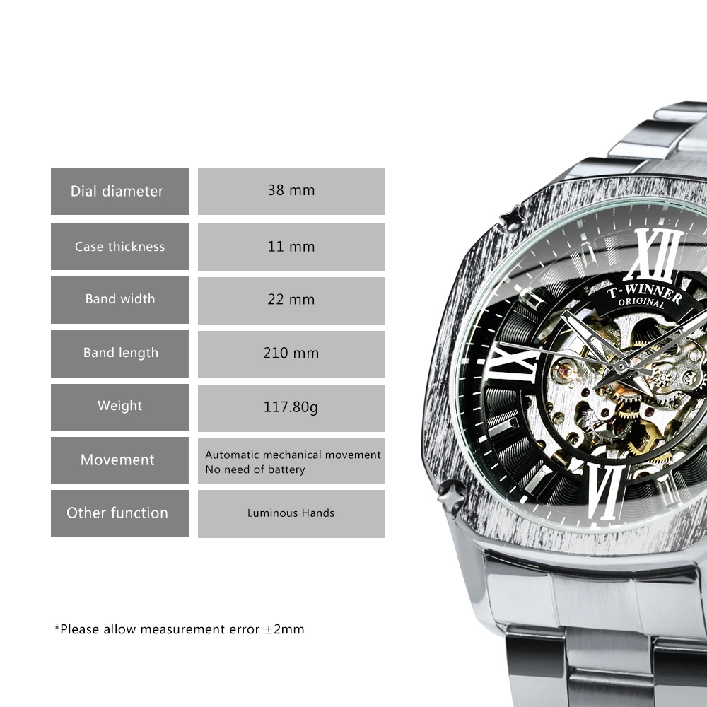 T-WINNER мужские часы в стиле хип-хопБренд: WINNER( T-WINNER)ПРИМЕЧАНИЕ. Официальный магазин завода Winner, 100% оригинальные подлинные часы, продажа оптом и в розницу.Стиль: Модный, Повседневный, деловой, роскошный, спортивныйОсновная особенность:1. Роскошные дизайнерские часы, модный модельный стиль.2. Новые модные тренды из нержавеющей стали ремешок часы.3. Гарантия на 12 месяцевХарактеристики:Диаметр циферблата: 38 ммЧехол Толщина: 11 ммДлина Часов: 210 ммШирина ремешка: 22 ммВес часов: 117,8 гМеханизм: автоматический самоветерМеханический (без необходимости батареи)Материал зеркала: HardlexТип застежки: складная застежка с безопаснойБлестящая фурнитураВодостойкость: водонепроницаемые для ежедневного ношения (не для купания или душа)Подходящий Случай:Идеально подходит для всех случаев и мероприятий: вечерние, юбилейные, деловые, повседневные, спортивные, домашние или повседневныеПосылка включает в себя:Часы-1 шт. (подарочные коробки на выбор)