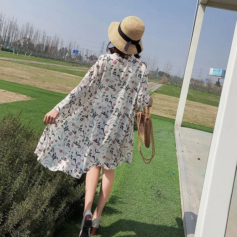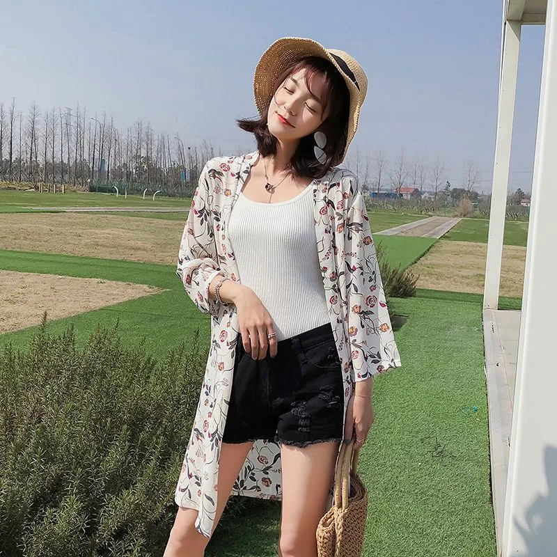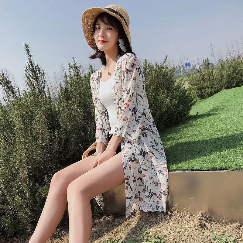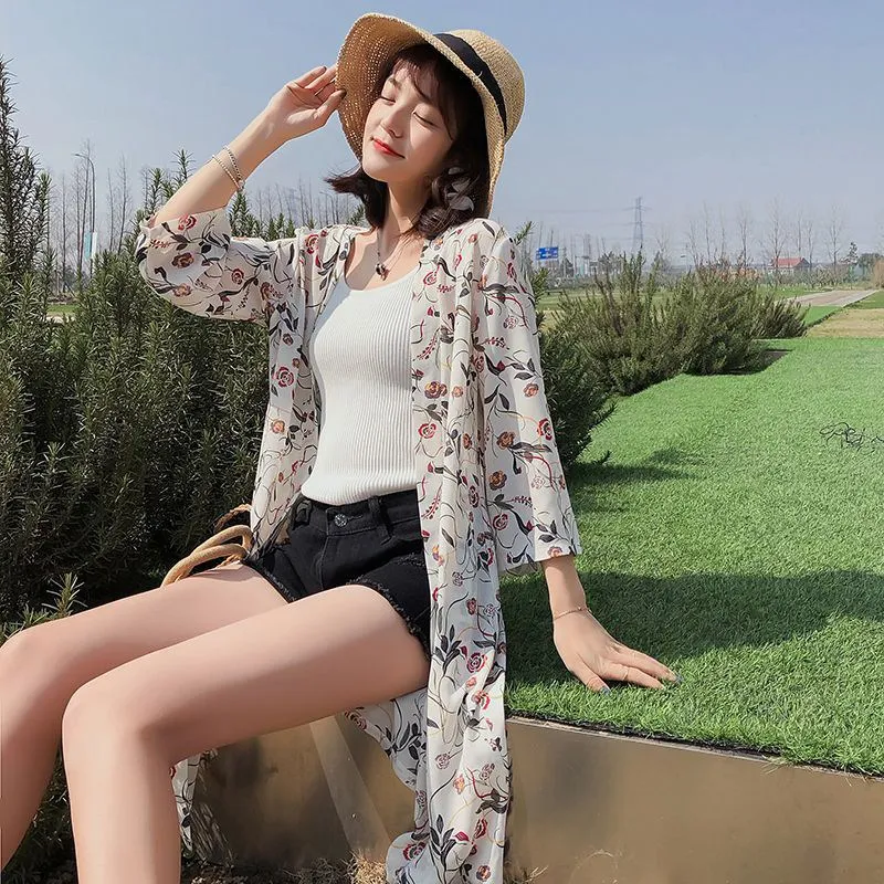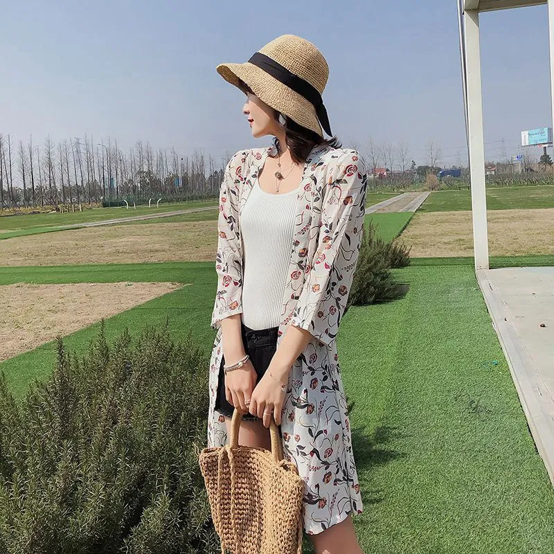 Женская шифоновая блузка средней длины, одежда с цветочным принтом и защитой от солнца и ветвей, кардиган для колледжа с рукавом в семиточечную клетку, лето 2019