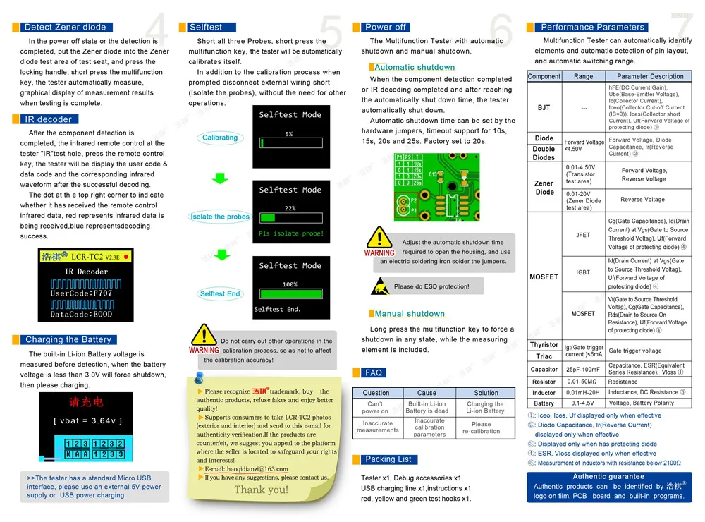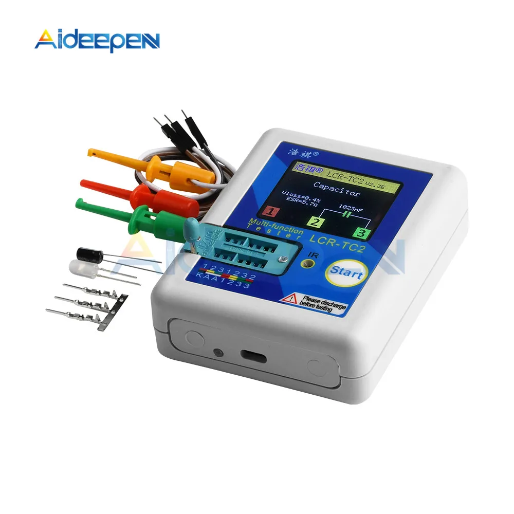 Он хорошо измеряет, но не распознает измеренный компонент в цепи. Компоненты должны быть опрессованы. У него короткие провода, всего 15 см. Терминалы скоро сломаются. В комплект входит заряжаемый аккумулятор 4,2 В. Но напряжение хранения должно быть 3,6 В. Если он был сохранен полностью заряжен, он поврежден.