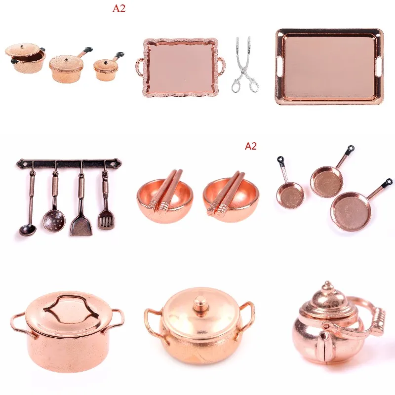 Кукольный домик в масштабе 1:12, миниатюрная сковорода бронзового цвета, кастрюля, чайник, кухонная утварь, набор для приготовления пищи, аксессуары для кукол