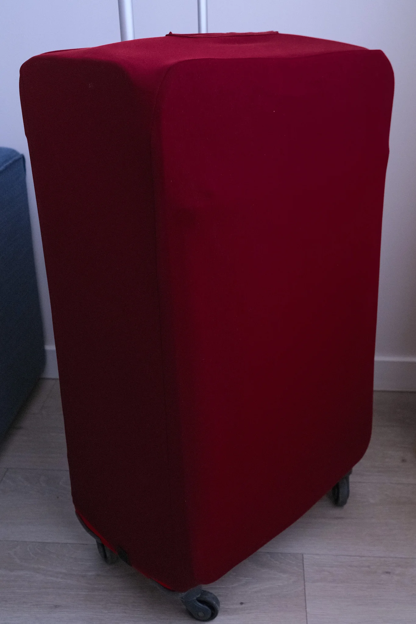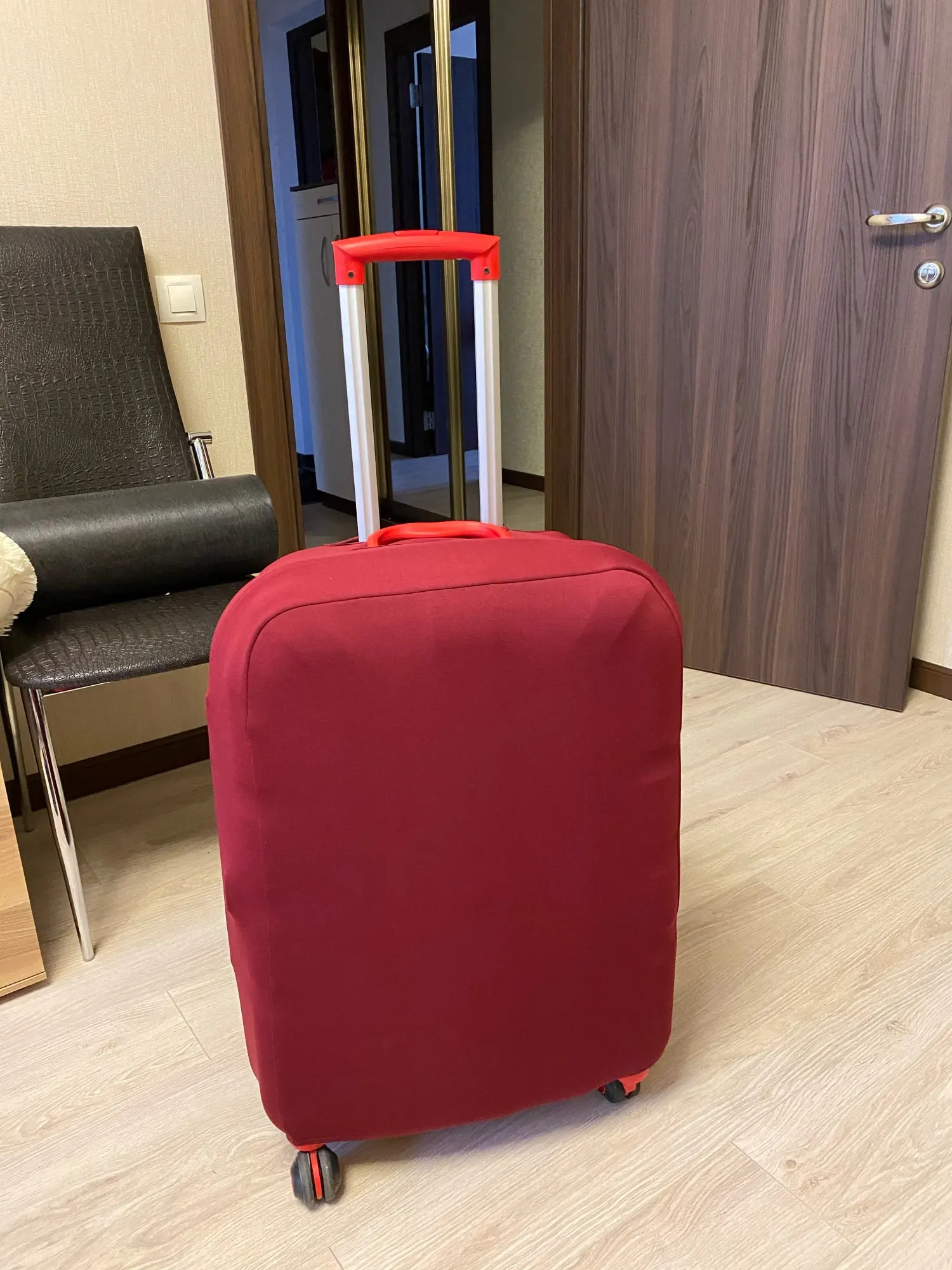 Красный цвет по факту темно-бордовый, чехол оказался темнее красного чемодана. Размер L идеально подошел на чемодан 70х45х28, отверстия под ручки совпали, но концы чехла длинноваты, придется укорачивать либо подворачивать под ремень.