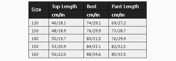 Особенности:Повседневные облегающие наряды из мягкого материала.Отличная идея как маленький подарок на день рождения для детей.Стиль: очень удобный, свободный крой, легкий и модный.Воздухопроницаемость. Нет вреда для кожи.Носите в разных случаях.Примечание:Фактический цвет может отличаться от того, что светильник отличается от изображения из-за различных эффектов монитора и светильникВозможны отклонения на 1-3 см вследствие измерений вручнуюАзиатский размер меньше, чем европейский, американский и британский размер. Пожалуйста, сравните данные о размере со своими перед покупкой.Спецификация:Материал: хлопокРазмер; Длина топа; Обхват груди; Длина брюк120:46 см 74 см 69 см130:48 см 76 см 73 см140:50 см 80 см 76 см150:53 см 84 см 82 см160:56 см 88 см 85 см