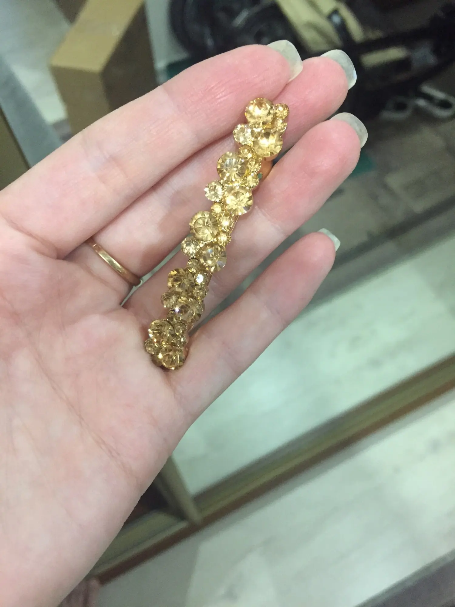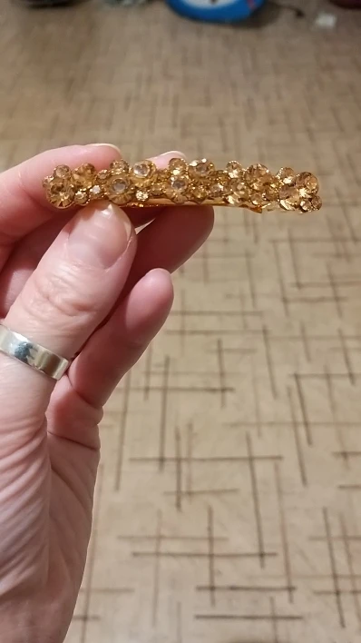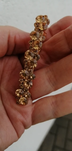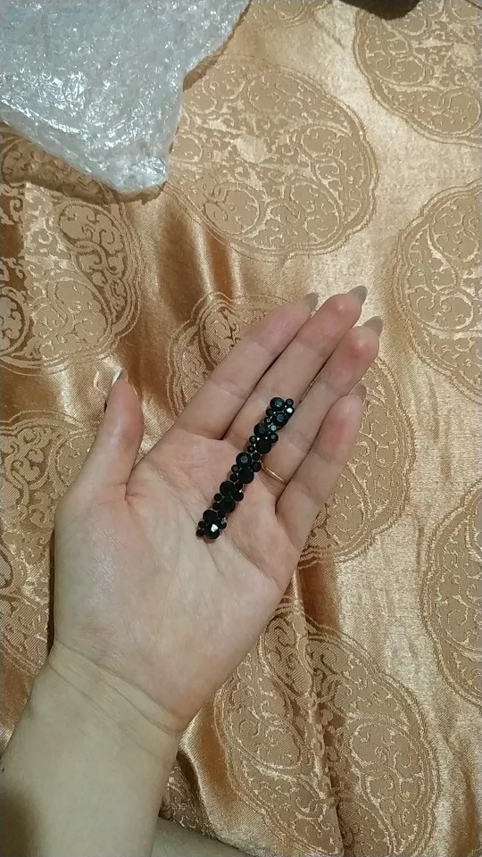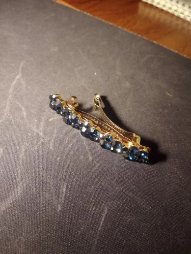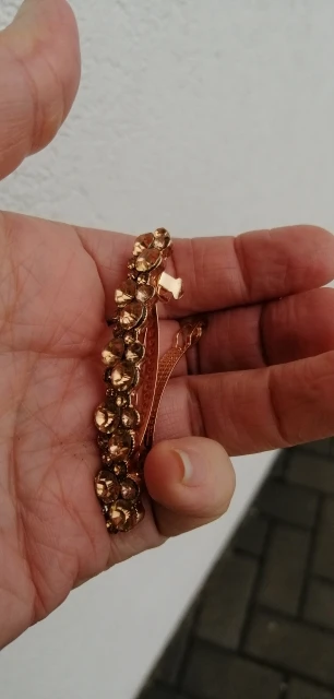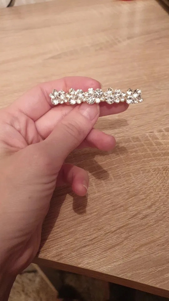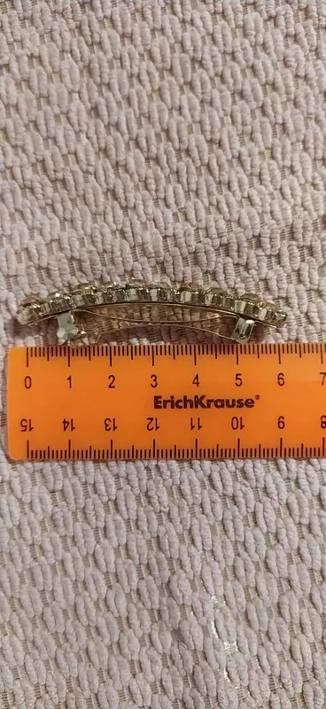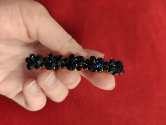 Очень красивая заколка, все как в описании. Но очень маленькая, 6 см в длину. Густой волос не захватывает. Пришла не повреждённая, все стразы на месте.