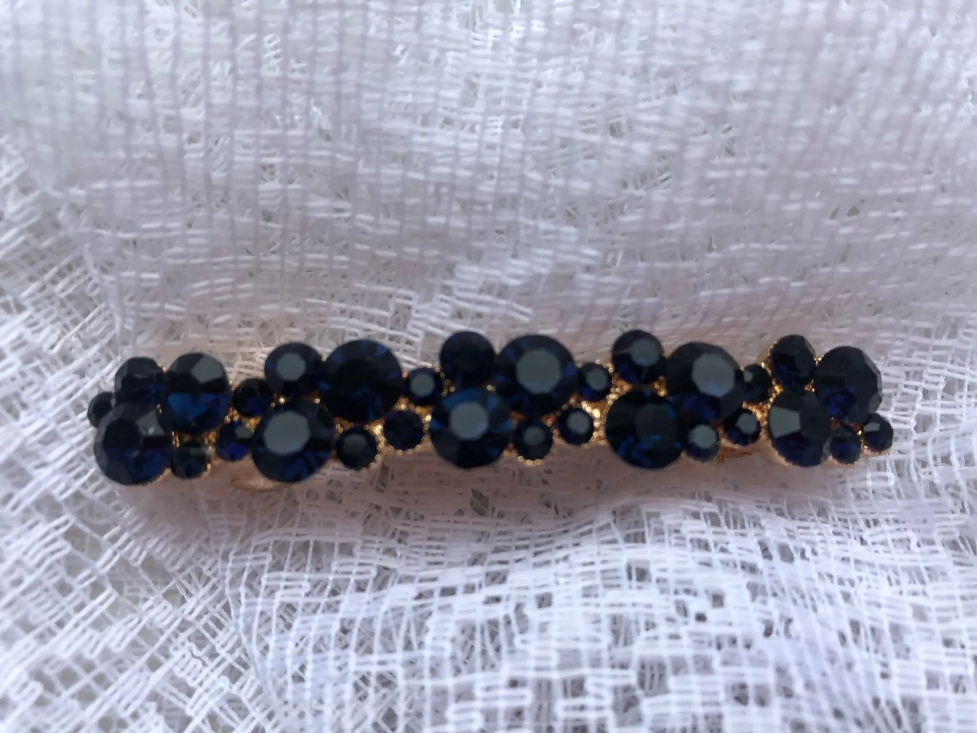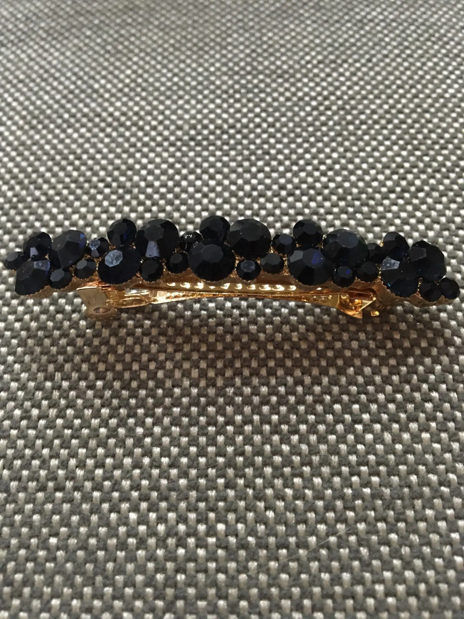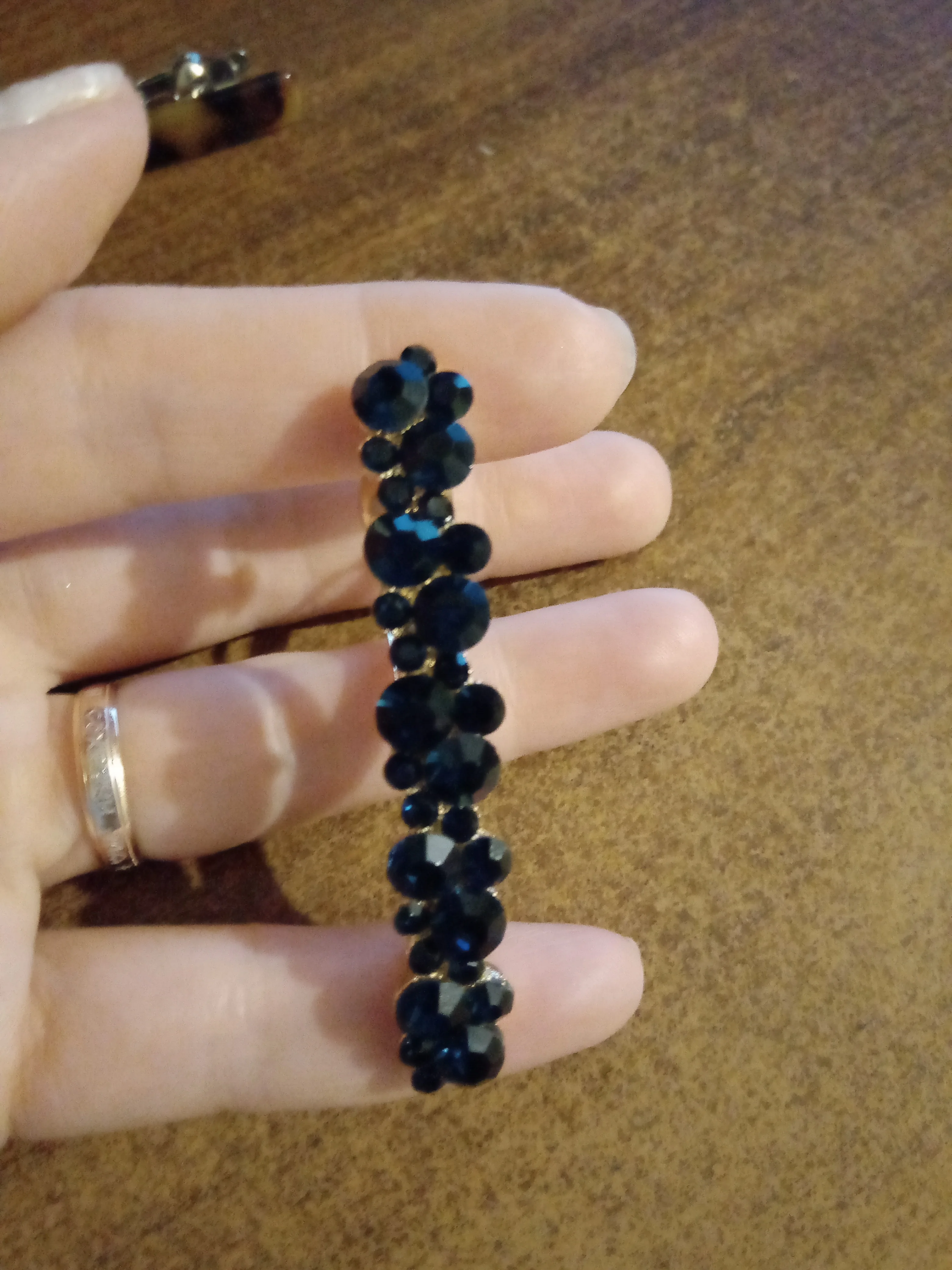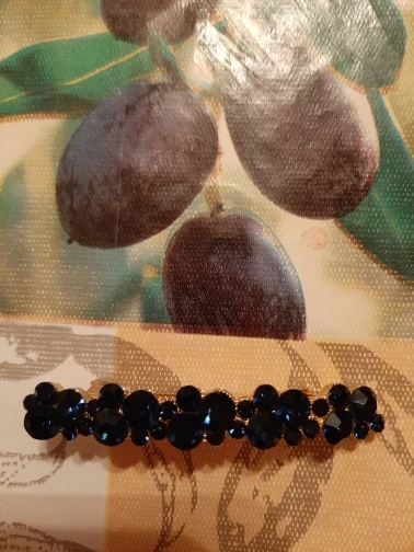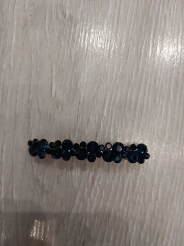 заколочка с темно синими стразиками, держит волосы хорошо. Доставка вовремя.