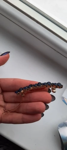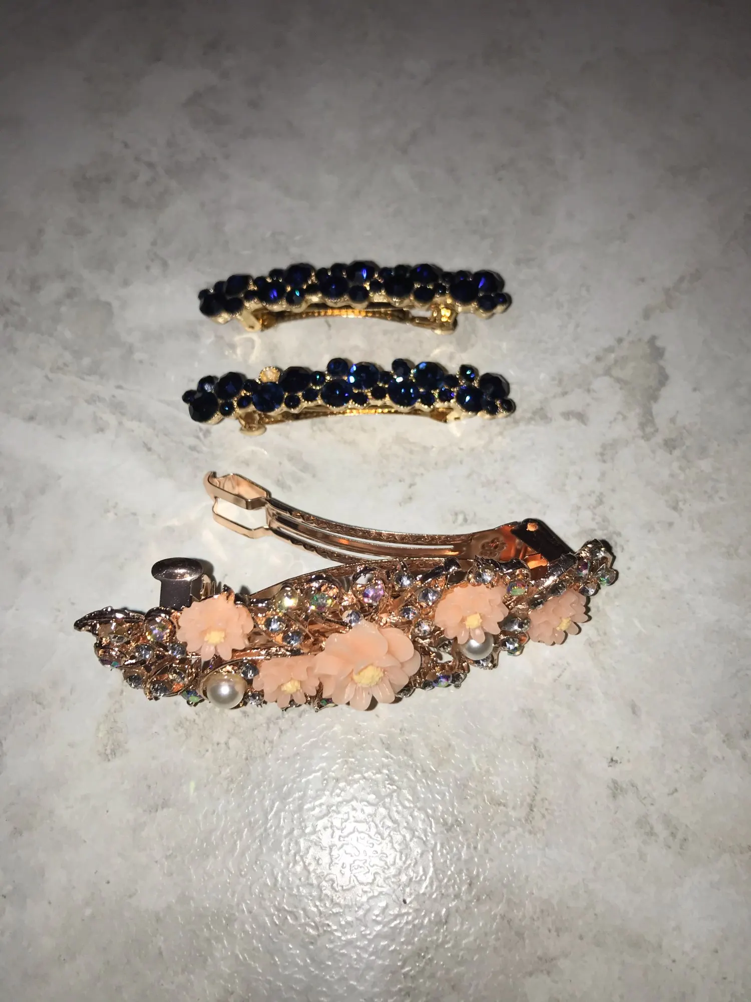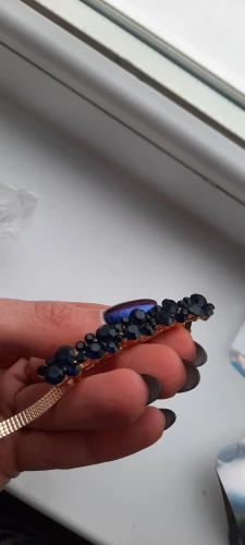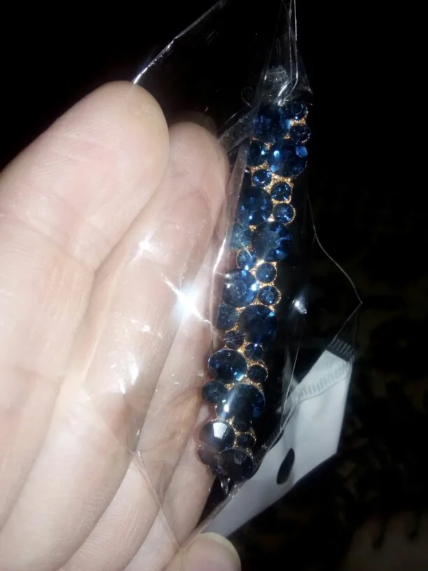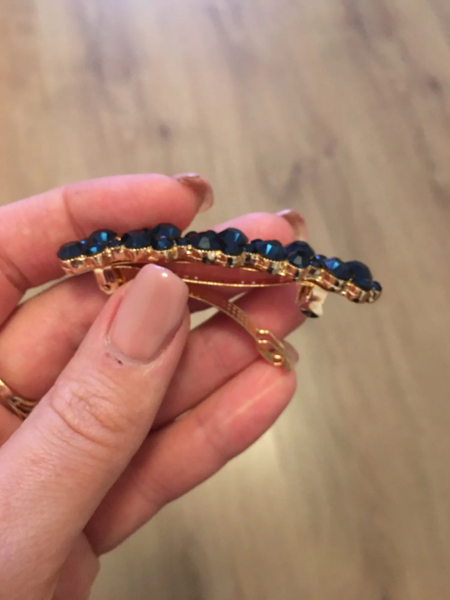 заколочка с темно синими стразиками, держит волосы хорошо. Доставка вовремя.