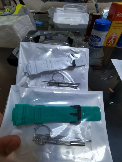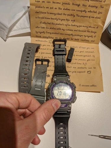 Товар пришёл быстро и всё вроде бы хорошо сним, гаечки, болтики, шпунтики, всё в подарок от продавца. НО ни я ни мой супруг так и не смогли. поставить ремешок на часы. Шплинты стоят в часах, но вместе с ремешком не ставится. Силикон вылит с браком(((((