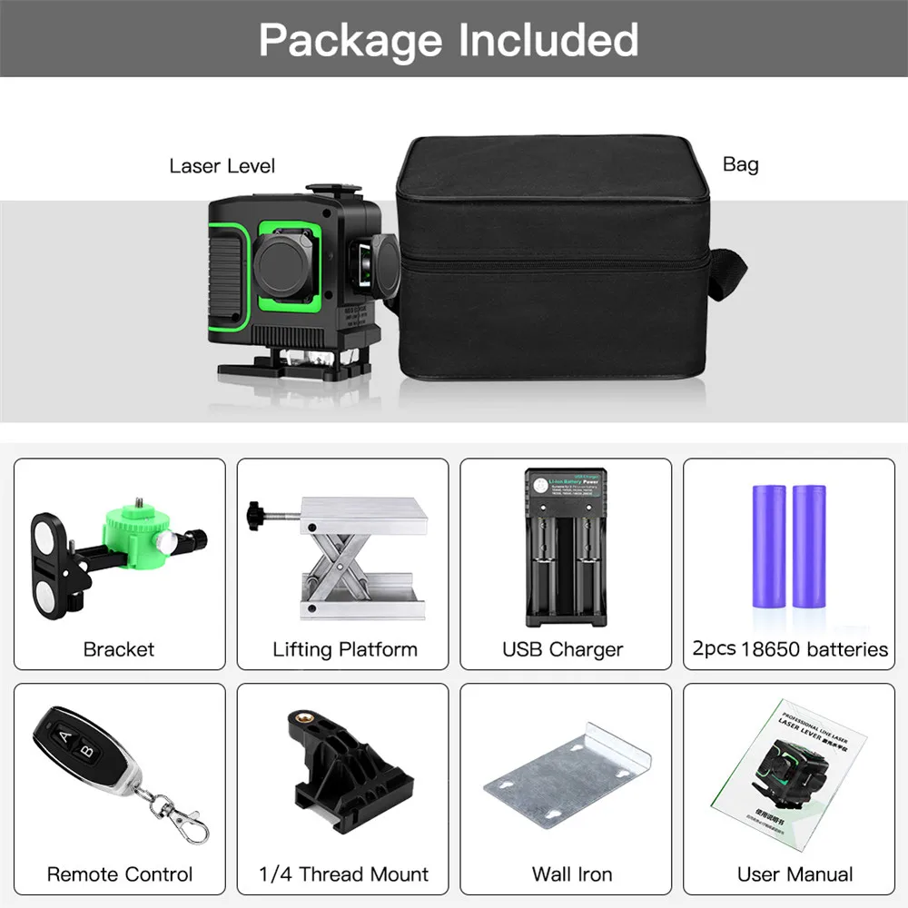 【POWER SAVING】: лазерный уровень проектирует зеленый светильник, который ярче стандартных красных лучей с рабочим диапазоном до 100 футов с ± 1 мм с точностью 23 фута. Срок службы может быть увеличен до почти 32 часов с 4 перезаряжаемыми батареями большой емкости 18650. Кроме того, аккумуляторы также можно заряжать напрямую через Зарядное устройство USB (в комплекте).
