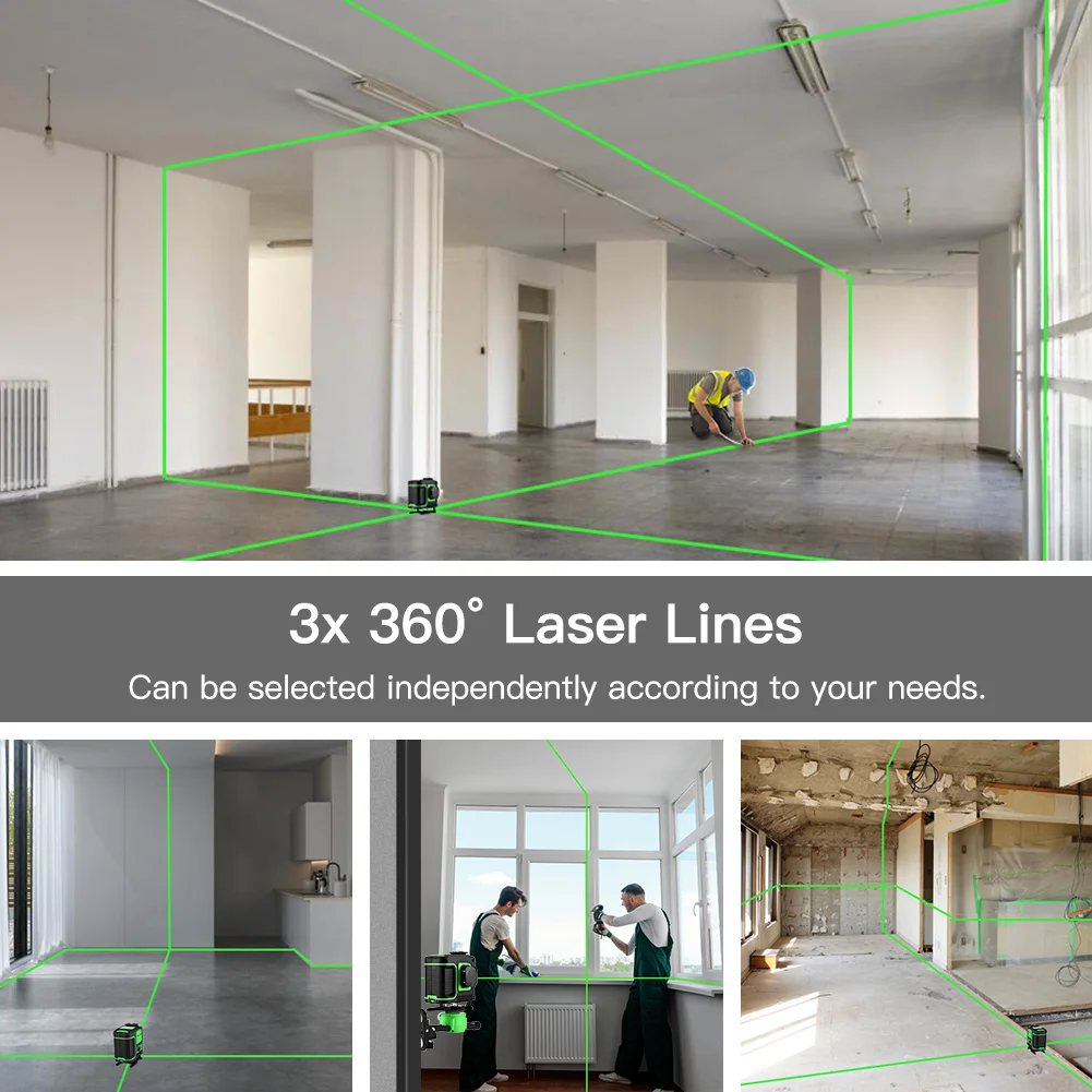 【 3X 360 ° Лазерная линия: одна 360 ° горизонтальная и две 360 ° вертикальные линии обеспечивают всестороннее выравнивание покрытия в пол, стену, потолок по всей комнате. Оснащен 2 лазерными окнами, которые могут проектировать лазеры, закрывающиеся на пол на расстоянии 6 мм (до стены: 7 мм), более точные и стабильные.