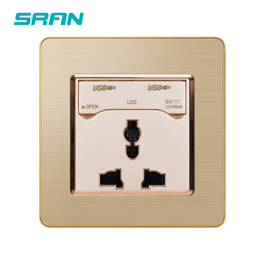 SRAN 3pin универсальное гнездо питания, гнездо с USB 3 отверстия 13A 2usb С Пылезащитным покрытием выход 5 в 2.1A панель из нержавеющей стали 86 мм * 86 мм