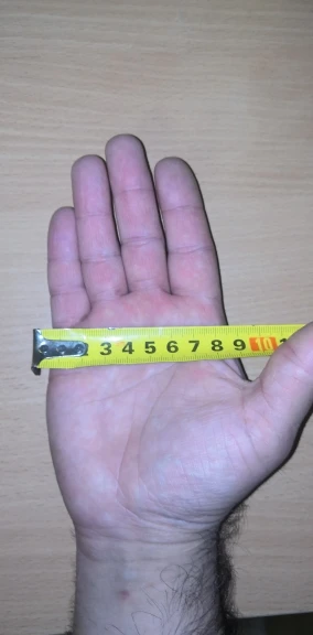 длина руки 18см,ширина 9см взял L как раз подошли.Выглядят хорошо,аккуратно сшиты