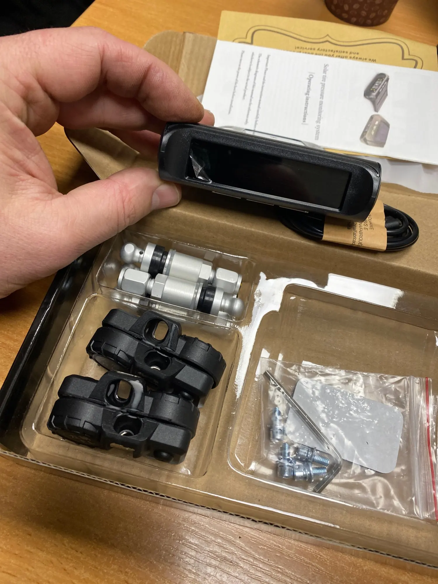 Получил эту приблуду. Хотелось убедиться, что она работает, прежде чем ставить в колёса. Из коробки прибор показывал какую-то ерунду. Почитав отзывы и комментарии понял, что датчики находятся в спячке пока в колёса не поставишь. Придумал как это обойти. Засунул датчики в пластиковую бутылку 5 литров и не закрывая положил её в морозилку. Через 15 минут открыл морозилку и завинтил крышу бутылки. Положил бутылку с датчиками на батарею. Давление в бутылкие выросло до 0.3 и датчики ожили. Правда ещё пришлось немного потрясти, чтобы симитировать движение. Можно ещё встать на бутылку чтобы ещё увеличить в ней давление. В общем всё заработало, правда три датчика увидел сразу, а 4-й почти через минуту. Можно ставить в колёса.