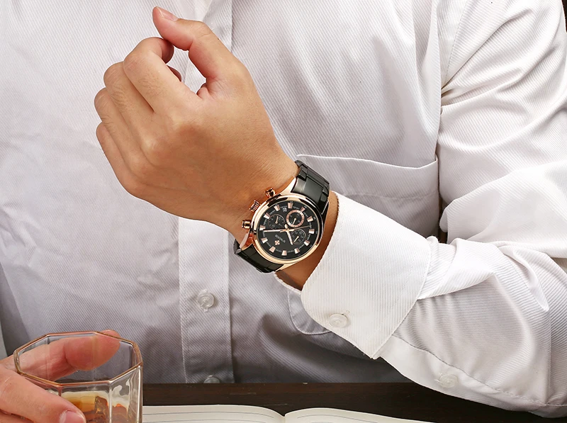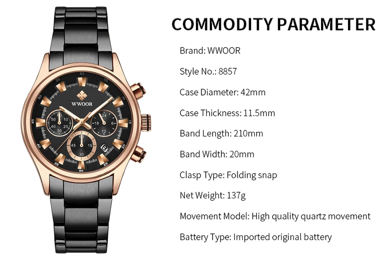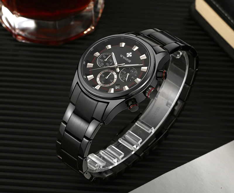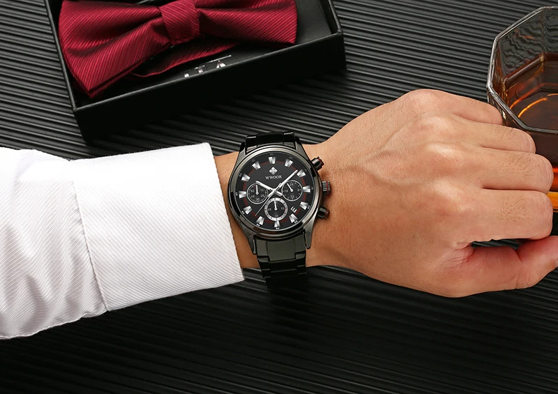 1x100% wwoor хронограф мужские часы1 подарочная коробка1 гарантийный талон1 инструмент для регулировки ремешка часов1 х чистая ткань1 x резервная батарея