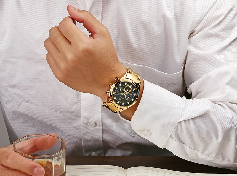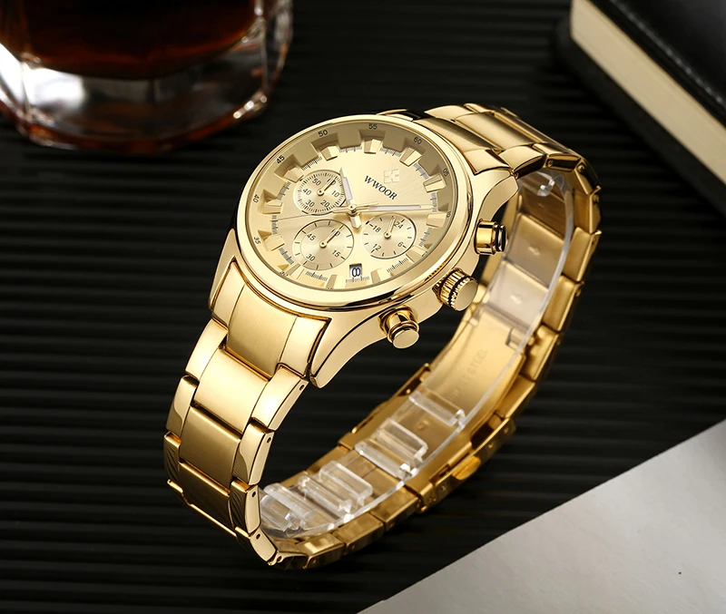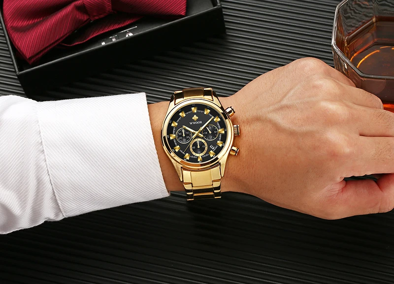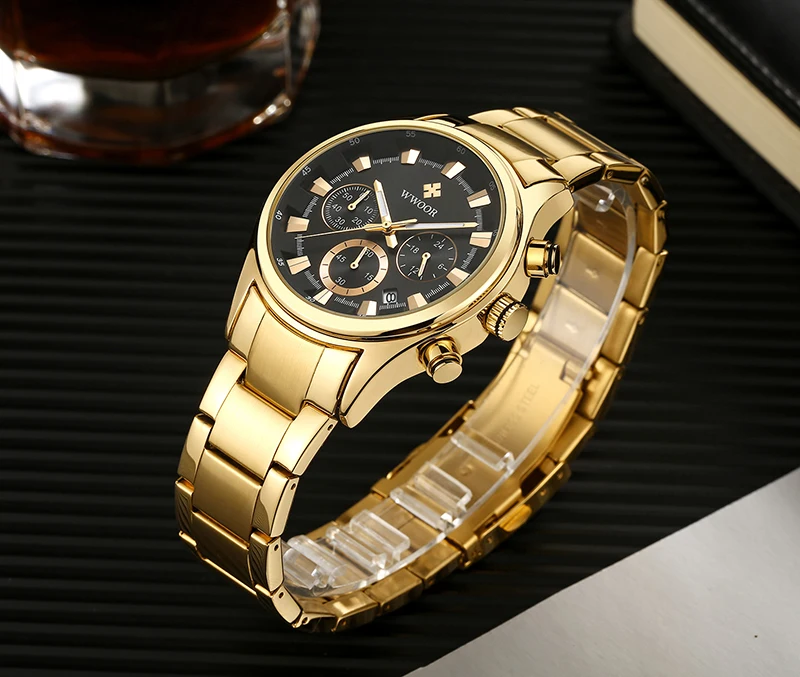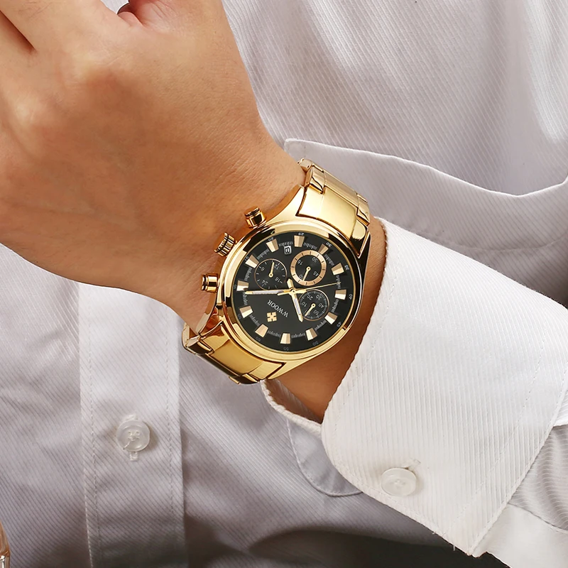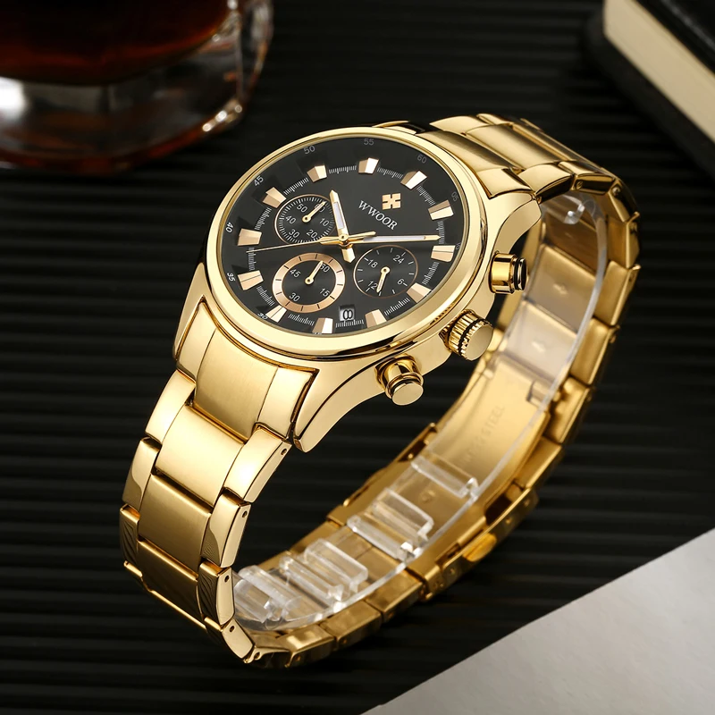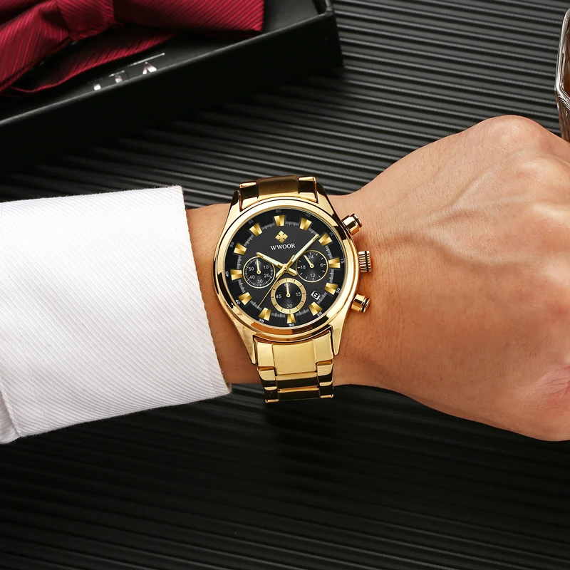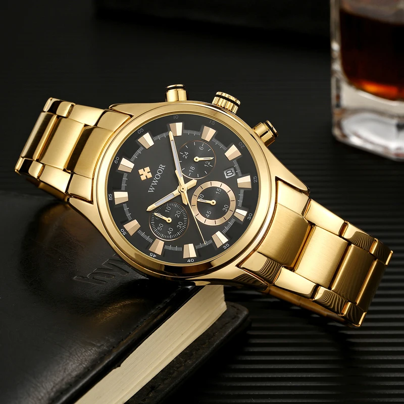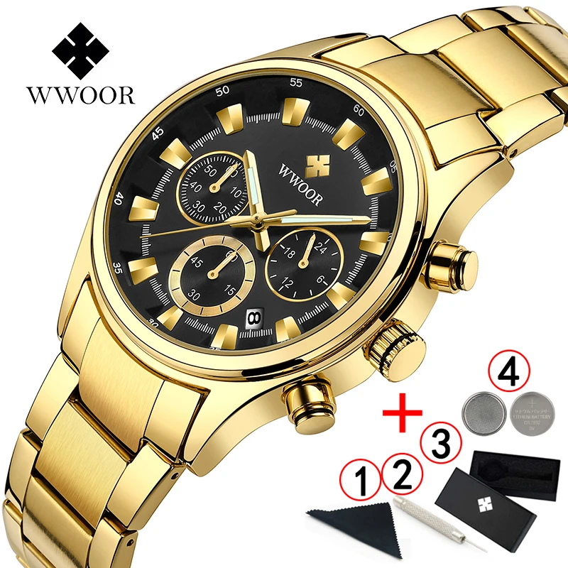 Часы наручные WWOOR мужские с хронографом, брендовые Роскошные водонепроницаемые, золотистые чёрные, 2021, 2022