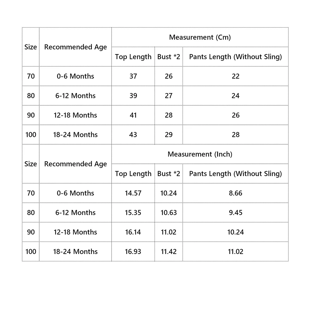 Размеры Рекомендуемый возраст Измерение (см) Длина верха Бюст * 2 Длина брюк (без бретелей) 70 0-6 месяцев 37 26 22 80 6-12 месяцев 39 27 24 90 12-18 месяцев 41 28 26 100 18-24 месяцев 43 29 28 Размеры Рекомендуемый возраст Измерение (дюйм) Длина верха Бюст * 2 Длина брюк (без бретелей) 70 0-6 месяцев 14,57 10,24 8,66 80 6-12 месяцев 15,35 10,63 9,45 90 12-18 месяцев 16,14 11,02 10,24 100 18-24 месяцев 16,93 11,42 11,02 Обратите внимание: если ваш ребенок пухленький, мы рекомендуем выбрать больший размер, спасибо. ^_^
