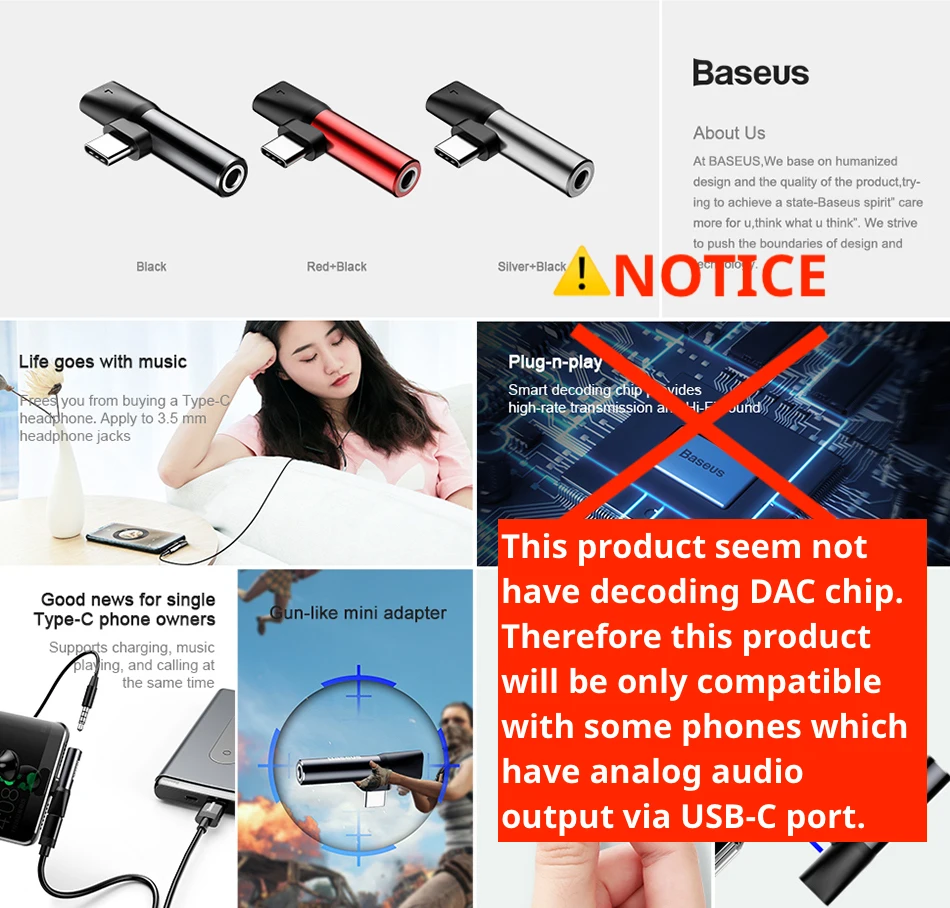 Прибыл быстро и в хорошем состоянии. Качество сборки очень хорошее. Но, описание этого продукта, кажется, ошибочно. Это не USB DAC/AMP, а аналоговый аудио «bypass» ключ с зарядкой. Я замечал, что некоторые пользователи говорят «хорошо работают», а другие говорят «не работают». Затем я протестировал Walkman A100(Android 9) и Unihertz Jelly2(Android 10), оба из них привели к «не работают» и обнаружены как «аналоговый аудио аксессуары». USB-C контактов отсутствуют для цифровой передачи данных и предназначены только для аналогового аудио-обхода. Хотя в описании этого продукта на странице указано, что «умный декодер обеспечивает высокую скорость передачи и hi-fi звук» с изображением микросхемы IC, но на самом деле у него нет чипа DAC «декодер». Если ваш телефон имеет внутренний DAC и может выводить аналоговый звук через USB-C, он будет «работать», но если нет результатов «не работает». Название продукта "... Для Xiaomi Mi9 для Huawei Mate 20 P30 Pro "означает эту спецификацию, я думаю. Я надеюсь, что Beseus улучшит точность описания продукта.