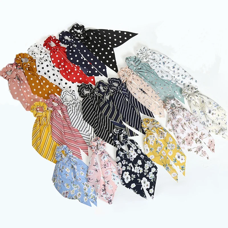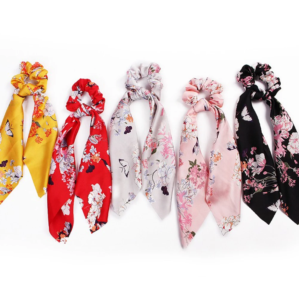 Женский атласный шарф для волос с цветочным принтом, эластичная повязка для волос в богемном стиле, лента с бантом, резинка для волос для девушек