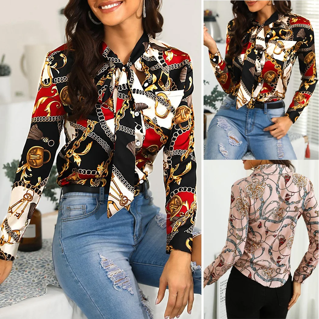 Женская офисная блузка с длинным рукавом, шифоновая блузка на пуговицах, на шнуровке, с бантом, на осень, 2019