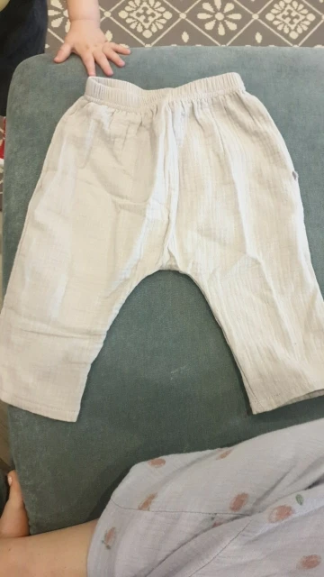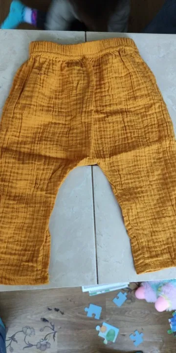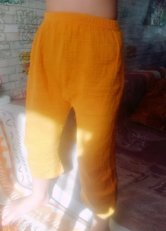 Штанишки укороченные, лёгкие, к телу приятные. Цвет скорее темно-жёлтый, ближе к горчичному, не соответствует цвету на фотографии. Ткань не тянется. Из-за этого мой подвижный ребёнок в первый же день носки порвал штаны поперёк шагового шва (или как это называется). На прикреплённом фото видно. Пришлось зашивать. То есть если ваш ребёнок поднимет ногу выше, чем на фотографии, которую использует магазин для демонстрации товара, скорее всего, штанишки будут порваны. С продавцом не общалась. Спор открывать не стала. Дома носить пойдёт.