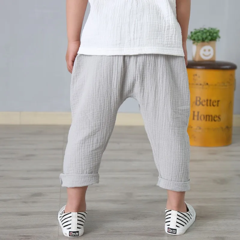 Детские штаны, для мальчиков и девочек, летние однотонные льняные плиссированные брюки до щиколотки, штаны для маленьких мальчиков, повседневные брюки-гаремы