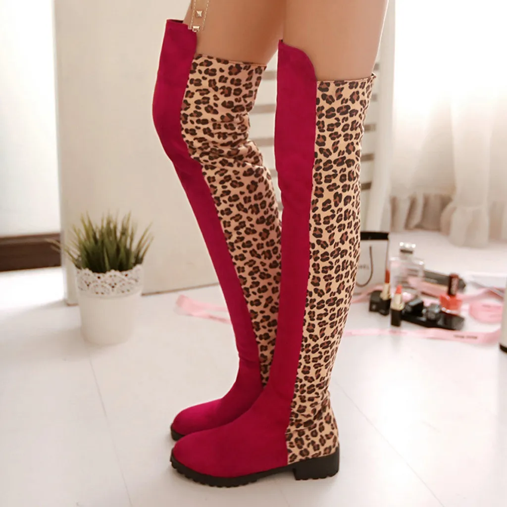 Женские леопардовые высокие сапоги, зимние длинные сапоги-туфли, женские стильные привлекательные Сапоги выше колена на низком каблуке, вечерние замшевые сапоги до бедра, 2019