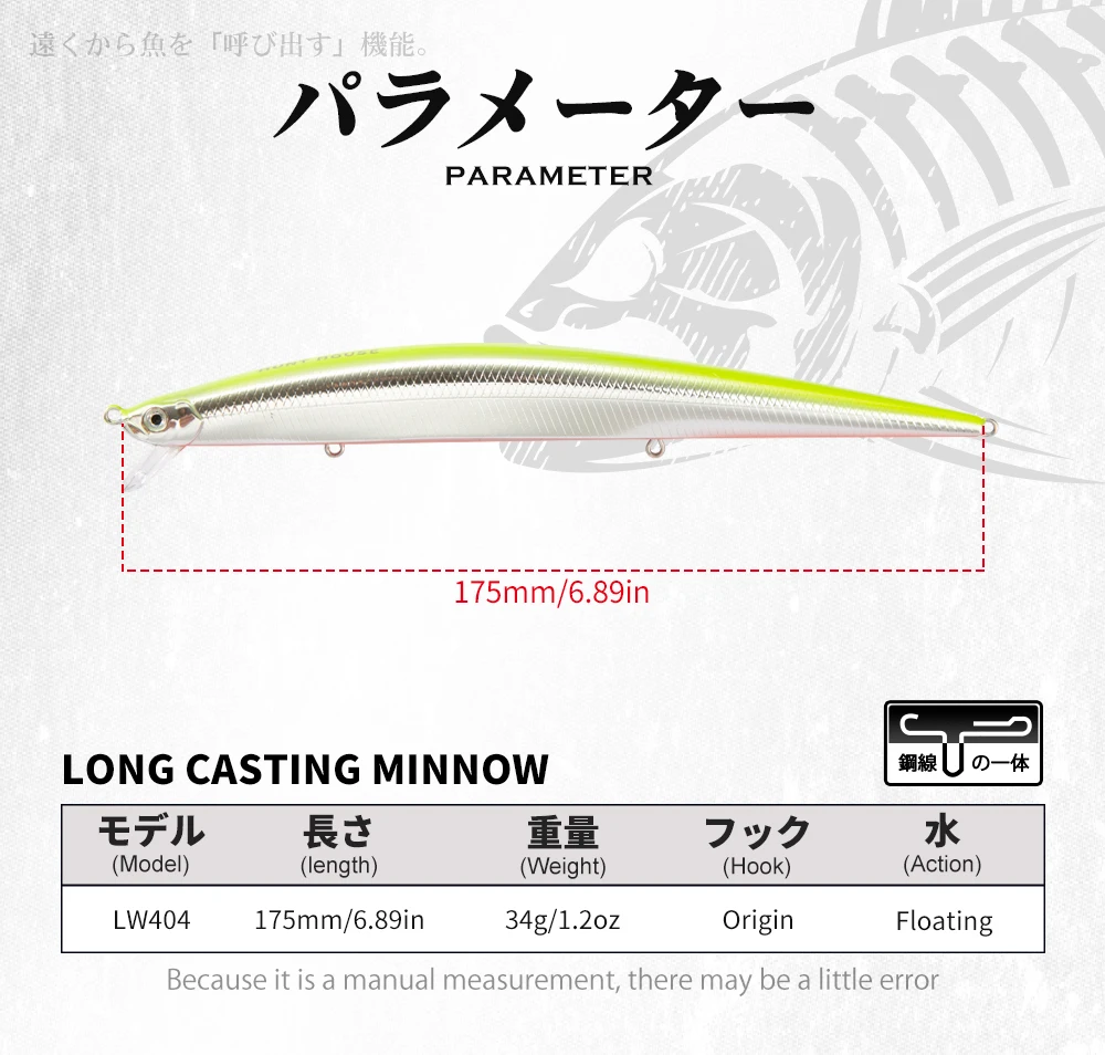 1. LW404 является приманкой, которая изменила стандарты размера тела. Она очень проста в обращении для своего размера, и доказала свой потенциал в Северной Японии не только с морем, но и морской форели.
