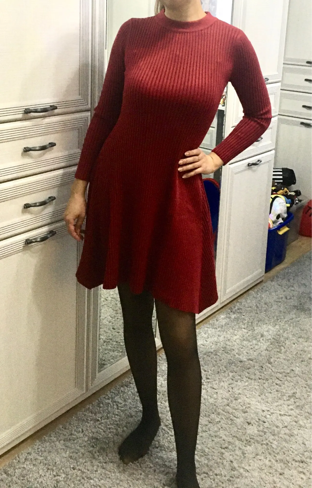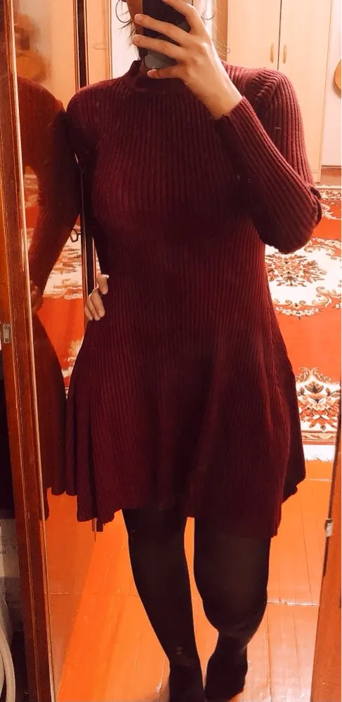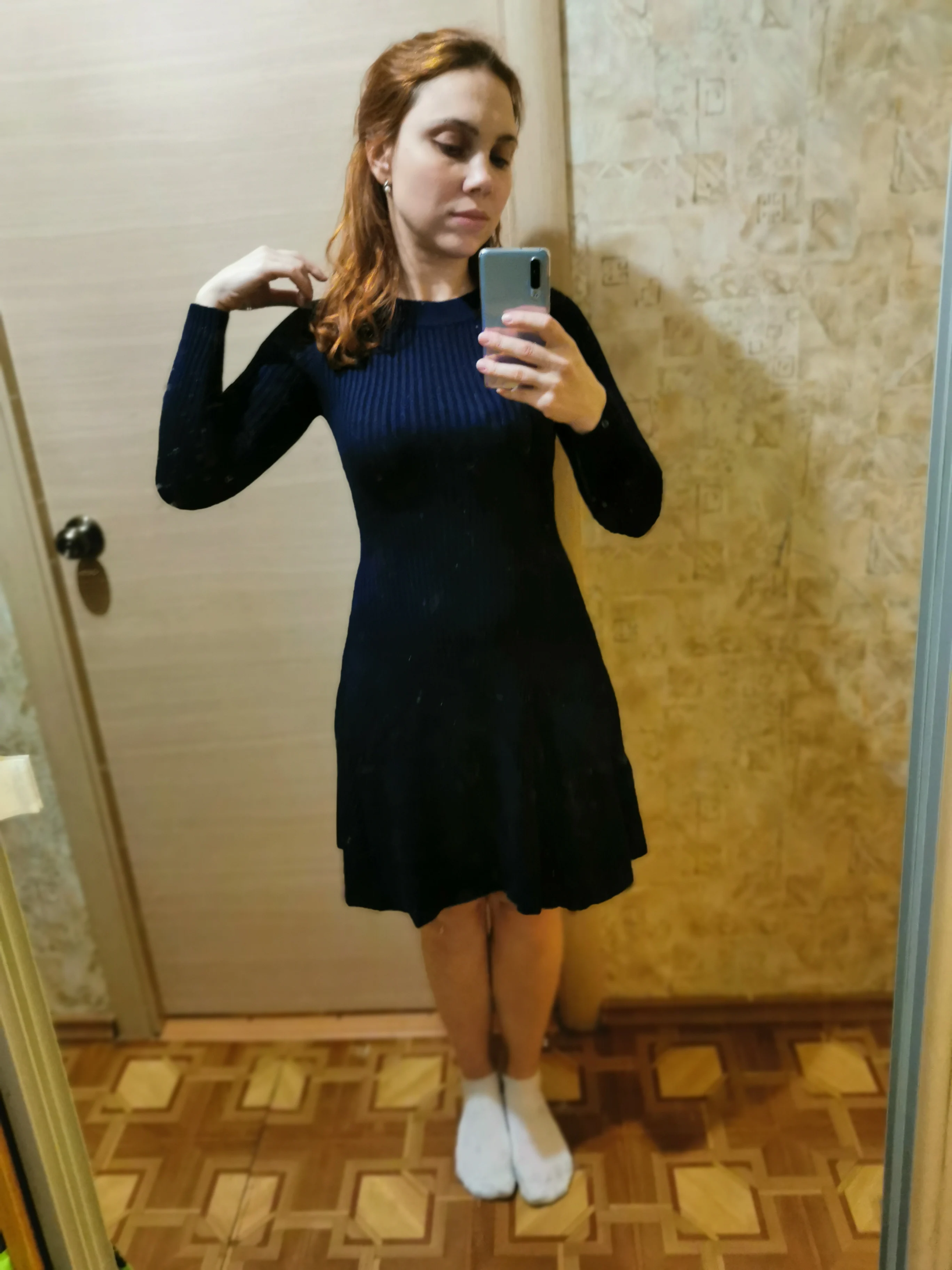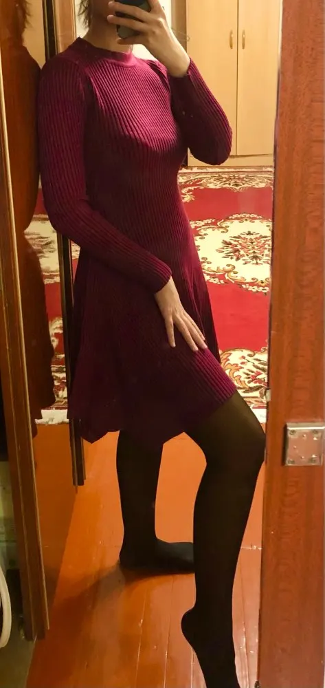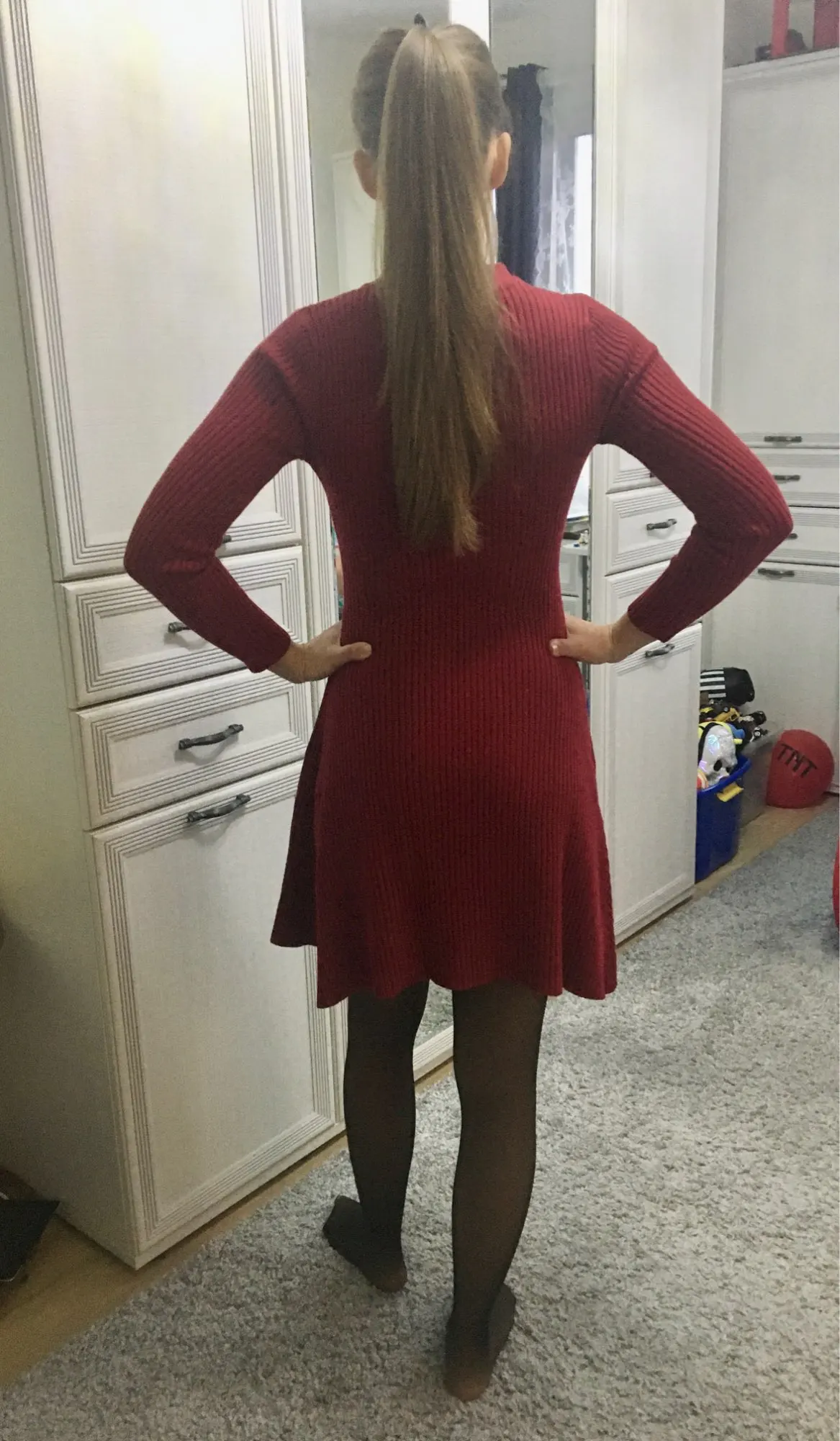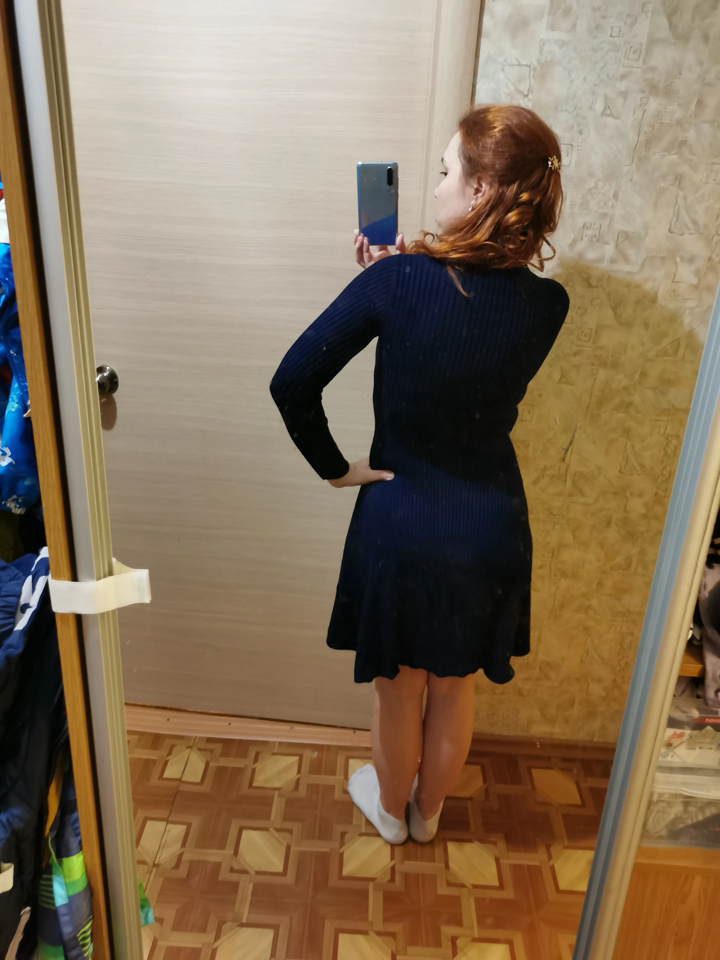 Платье классное, мягкое, приятное к телу, теплое. Цвет шикарный. На моей фигуре смотрится великовато (параметры: ог80, от61, об 86), но мне оно всё равно нравится. Пришло довольно быстро, около 2х недель. Фото после дня носки, немного вытянулись в локтях и на спине складочка, но так всегда бывает с такими платьями.