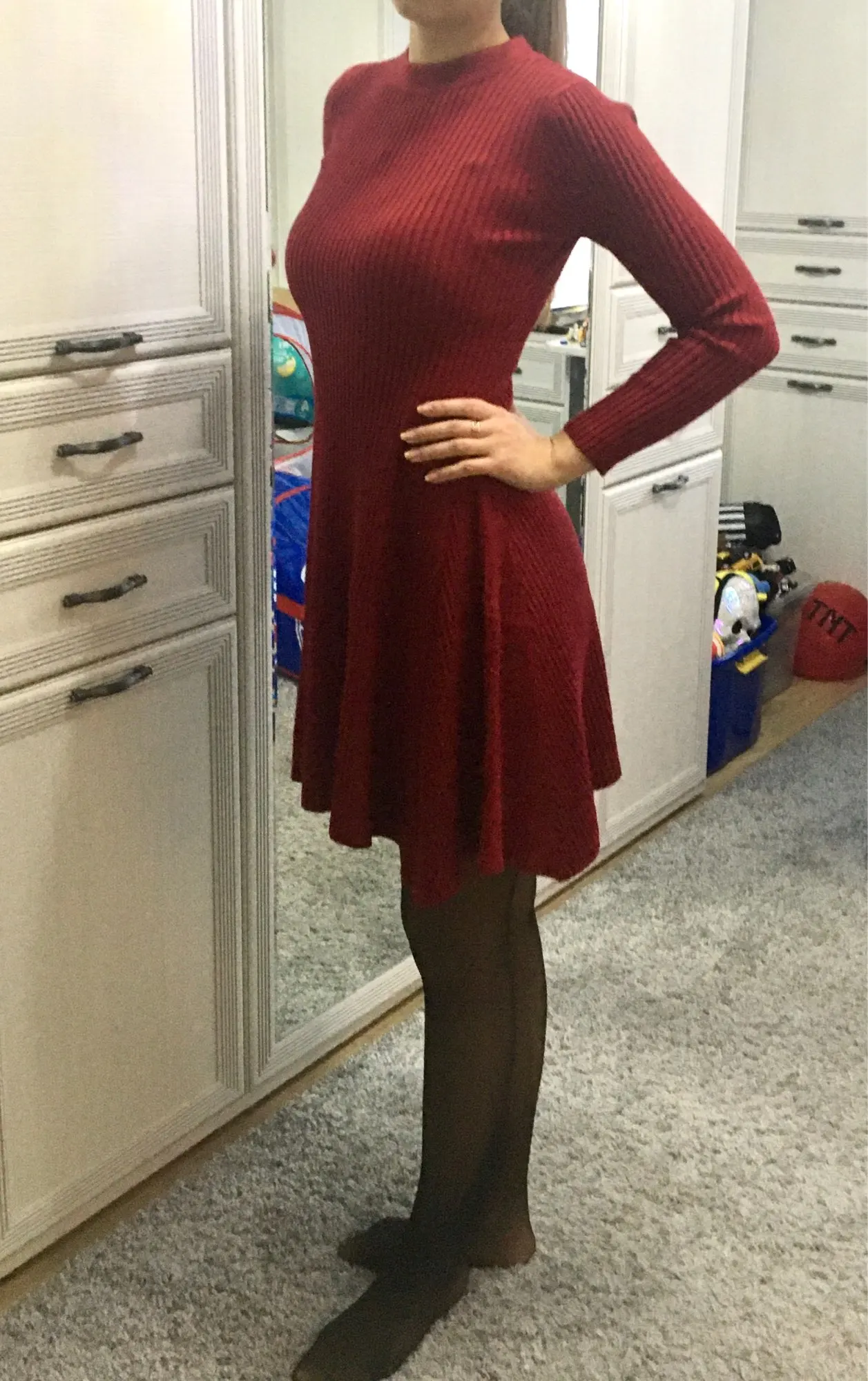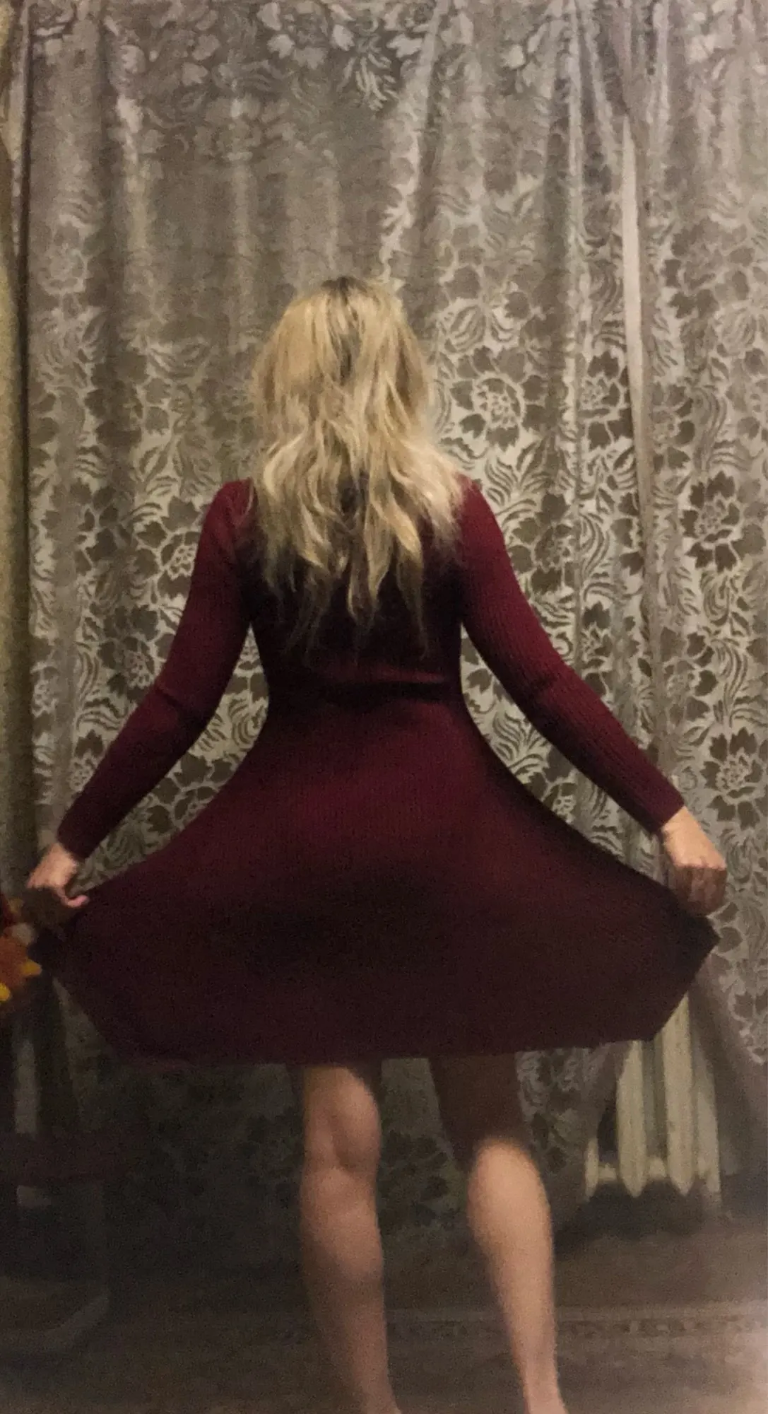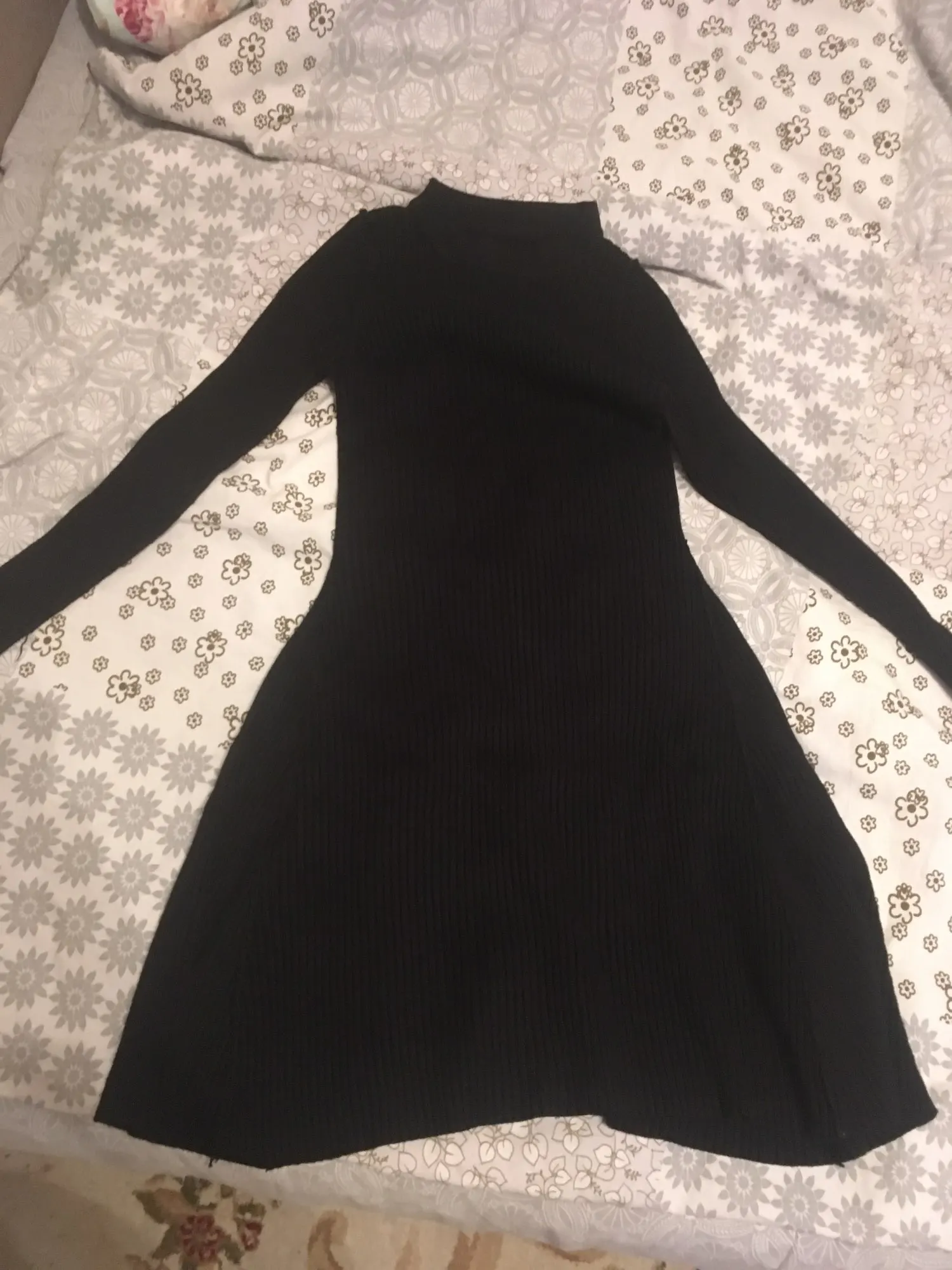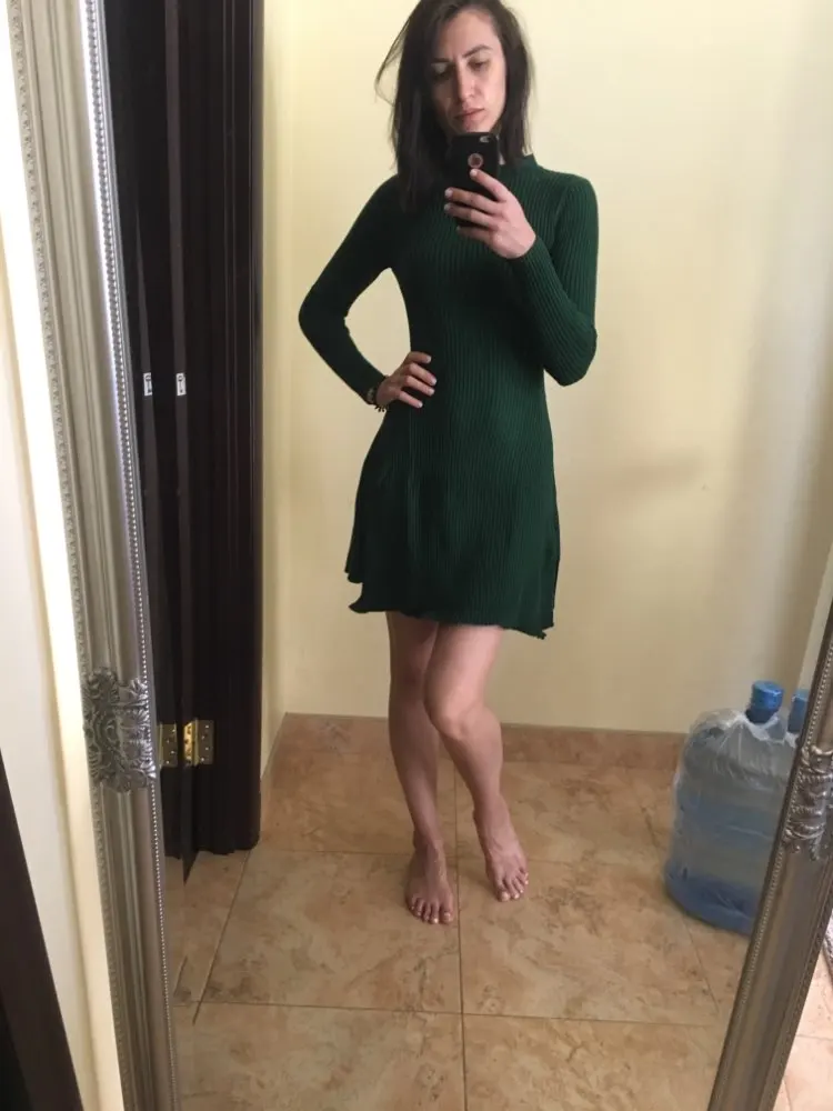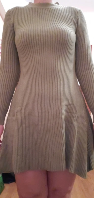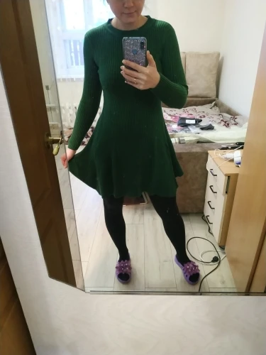 Платье классное, мягкое, приятное к телу, теплое. Цвет шикарный. На моей фигуре смотрится великовато (параметры: ог80, от61, об 86), но мне оно всё равно нравится. Пришло довольно быстро, около 2х недель. Фото после дня носки, немного вытянулись в локтях и на спине складочка, но так всегда бывает с такими платьями.
