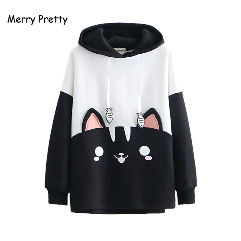 Женская толстовка с капюшоном Merry Pretty, черная толстовка с вышивкой из мультфильма, с длинным рукавом и круглым вырезом, утепленный бархатный пуловер, зима 2021